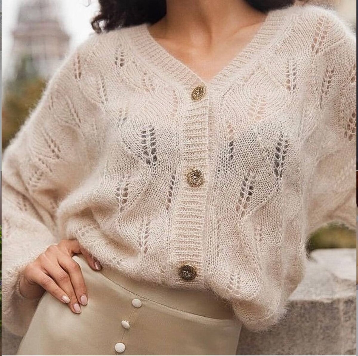 Кардиган сделан немного укороченным, длиной чуть ниже талии. Внизу – широкая резинка. Плечо спущенное.