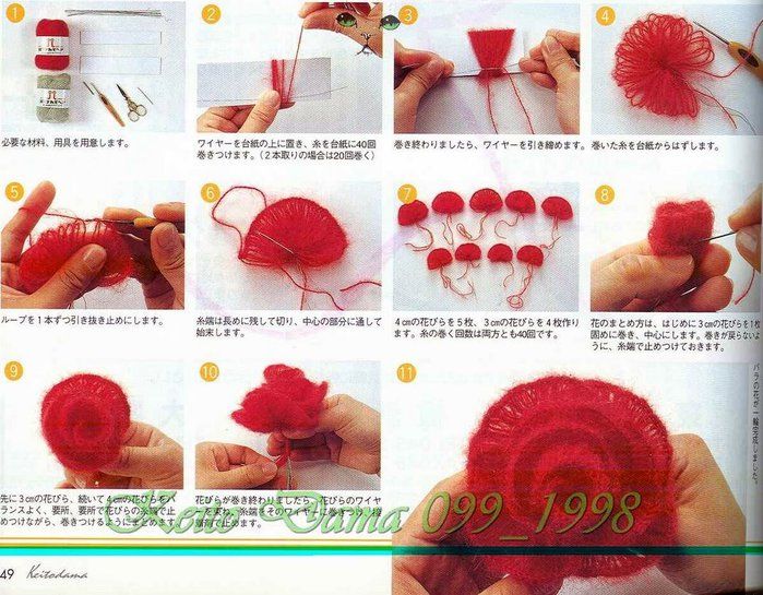 [показать]Обмотать прямоугольный шаблон нитками, обвязать крючком, получившиеся 4 маленьких и 5 больших лепестков соединить в розу.Совершенно шикарно, и, как у меня водится, из разряда "раз-два-сделал". Схема под катом.