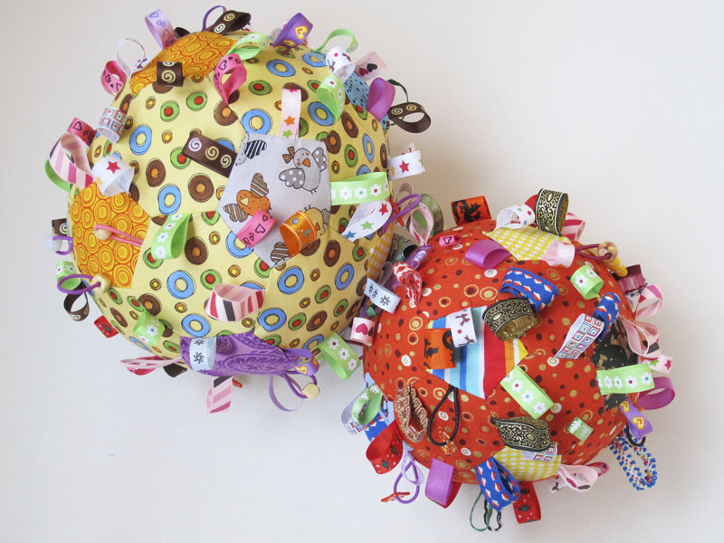 Кроме бусин различных форм и размеров в мячик можно ввязать пуговицы. Сейчас в продаже можно найти много пуговиц в виде животных, смешных рожиц, цветочков. Все эти детали не пришиваются к уже связанному мячику, я ввязываются в него по ходу процесса. Так гораздо надежнее.