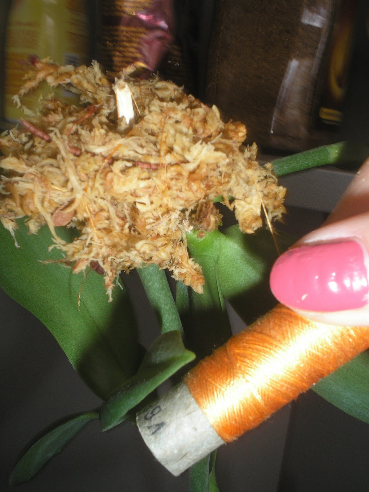 5. Выбираем на детке место, к которому будем приматывать мох. Приматывать мох нужно достаточно плотно, чтобы мох не рассыпался, но при этом стараться не повредить само растение.