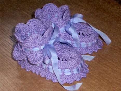 Вам потребуется: около 50 г ниток, крючок 1,5 - 2, несколько бусин и атласная лента. Вязание начинаем с подошвы. Набрать 19 в. п., обвязать цепочку с двух сторон столбиками с накидом (см. схему). Выполнить подошву согласно схеме и приступить к вязанию боковинок.