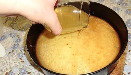 Все ингредиенты смешать и поливать приготовленный бисквит.