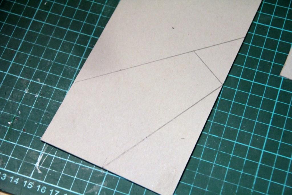 Начинаем строить держатель для фоторамки. На оставшемся листе картона, от крайнего угла, отмеряем 5 см и ставим точку. Прикладываем транспортир к этой точке и отмеряем тупой угол 120 градусов. Через полученную точку, чертим линию нужного размера (я провела до конца картона).
