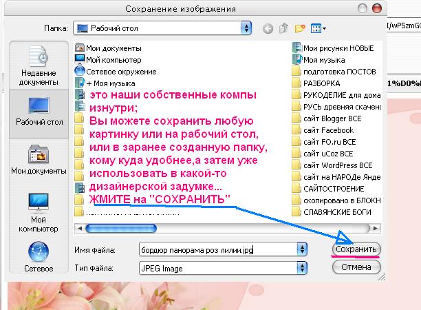 ...для тех , кто еще не знает , как скопировать на свой компьютер любую понравившуюся ему картинку,независимо от того фон ли это,анимация или что-то другое , советую поступать следующим образом: ВСЕ КАРТИНКИ КЛИКАБЕЛЬНЫЕ 1. -просто нажмите на изображение левой кнопкой мышки - оно откроется в новом окне в размере оригинала; -затем уже правой кнопкой мышки нажмите на картинку,откроется таблица; -в таблице опять левой кнопкой нажмите на строку "СОХРАНИТЬ изображение как"; 2.НАЖАВ на "Сохранить изображение как",Вы попадете в свой собственный компьютер и сохраняете картинку туда,где Вам удобнее - на рабочий стол или заранее созданные тематические папки, просто ЖМИТЕ на "СОХРАНИТЬ". |