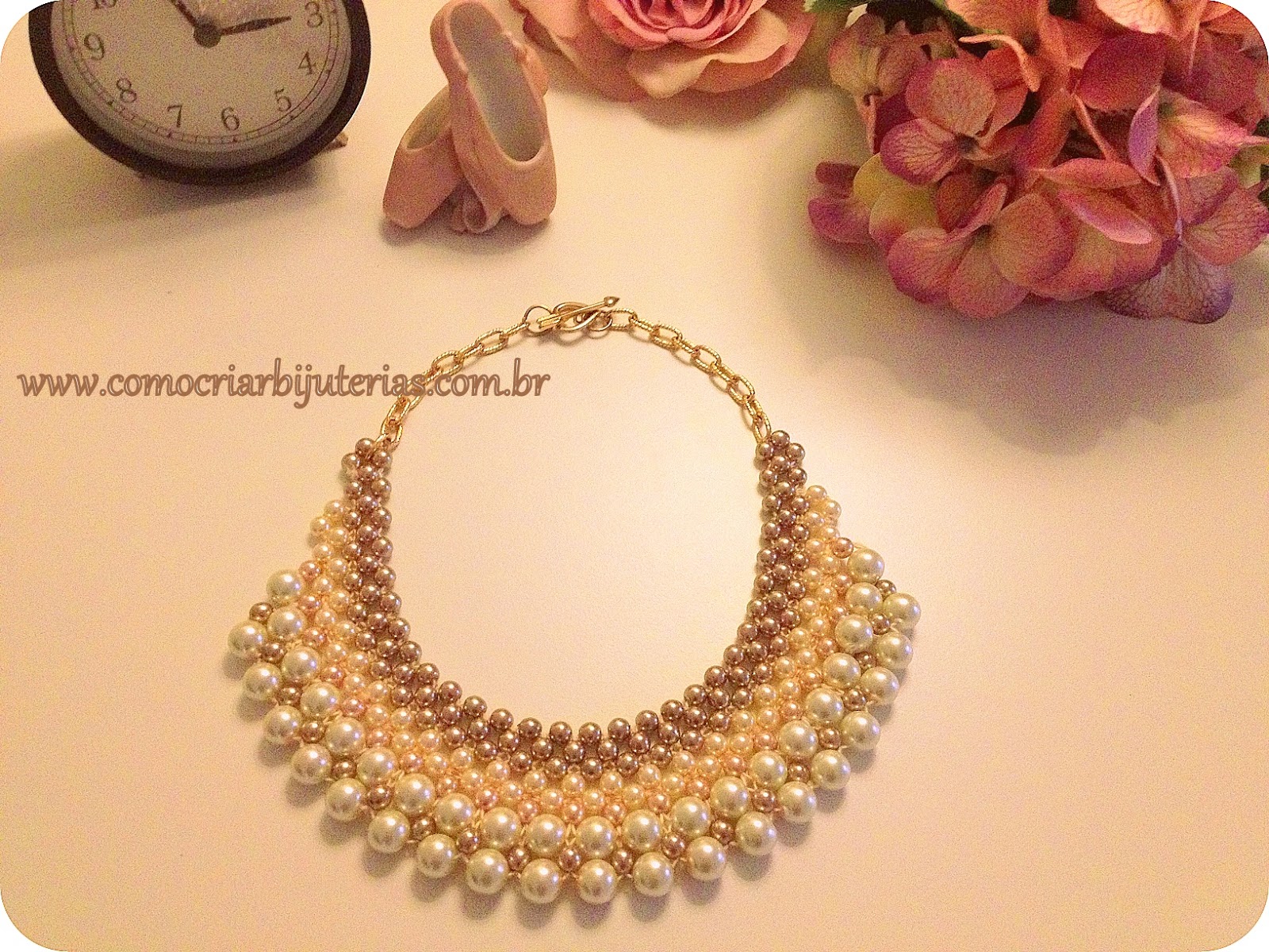 Круглые бусины размером от 3 мм до 8 мм хорошо смотрятся в этом колье и браслете, постепенно увеличиваясь от замочка до середины, сплетенные в технике ажурного жгута. Натуральные камни будут отличным выбором (если вы сможете подобрать необходимого размера для этого украшения). Кристаллический жемчуг хорошо смотрится в этом колье и с ним очень хорошо работать, можно подобрать различные цвета и оттенки. Автор этого проекта Синтия По.