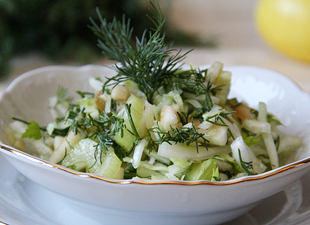 Сельдерей и яблоко порезать, сразу выдавить в салатник сок одного лимона, перемешать. Таким образом яблоки в салате не потемнеют. Потом порезать укроп, сделать заправку. всё перемешать. Выложить горкой на тарелки, сверху разложить красный лук, а креветки по краям. Очень вкусно получается. Особенно если запить бокалом красного сухого вина.