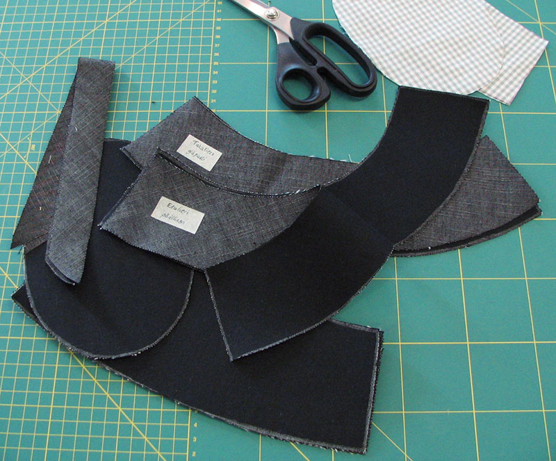 Stabilizing: Cut interfacings for areas shaded in grey on small-scale patterns and fuse them to exterior hat panels (cut interfacings with 5 mm seam allowances).