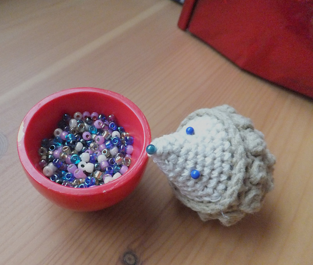 Вам потребуется: пряжа «Детский каприз» (60% мериносовая шерсть, 40% фибра, 225 м/50 г) - остатки серого и белого цветов, спицы №1, синтепон, бусины.