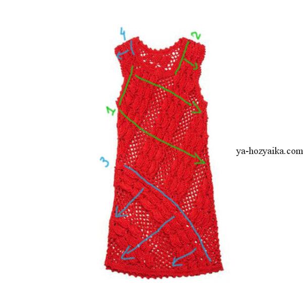[показать]Стильное красное платье крючком с узором «ракушки» и сеткой. Направление вязания думаю так