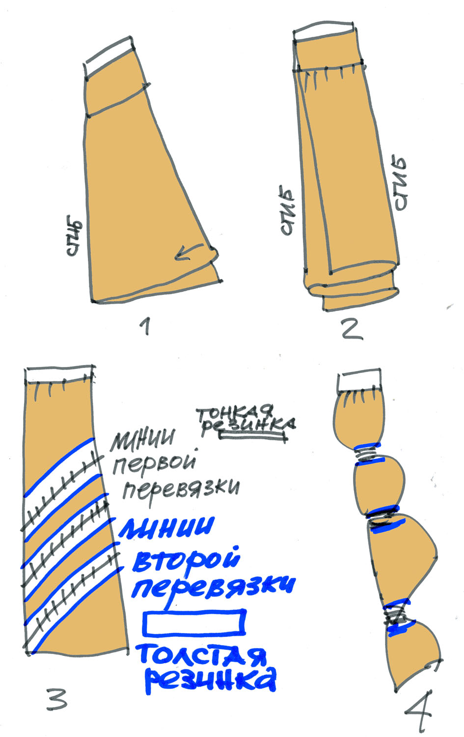 Поройтесь у себя в гардеробе - для покраски можно взять уже готовую надоевшую светлую из НАТУРАЛЬНОЙ ткани юбку. Сделайте первую перевязку по схеме. Старайтесь не просто перевязать ткань , а собрать её ровной гармошечкой, тогда на юбке будет точный геометрический рисунок. В ведре горячей воды с тремя ложками поваренной соли растворите оранжевую или жёлтую краску. Один пакетик. Опустите всю юбку в краску и полчаса выдержите её в растворе иногда помешивая его.
