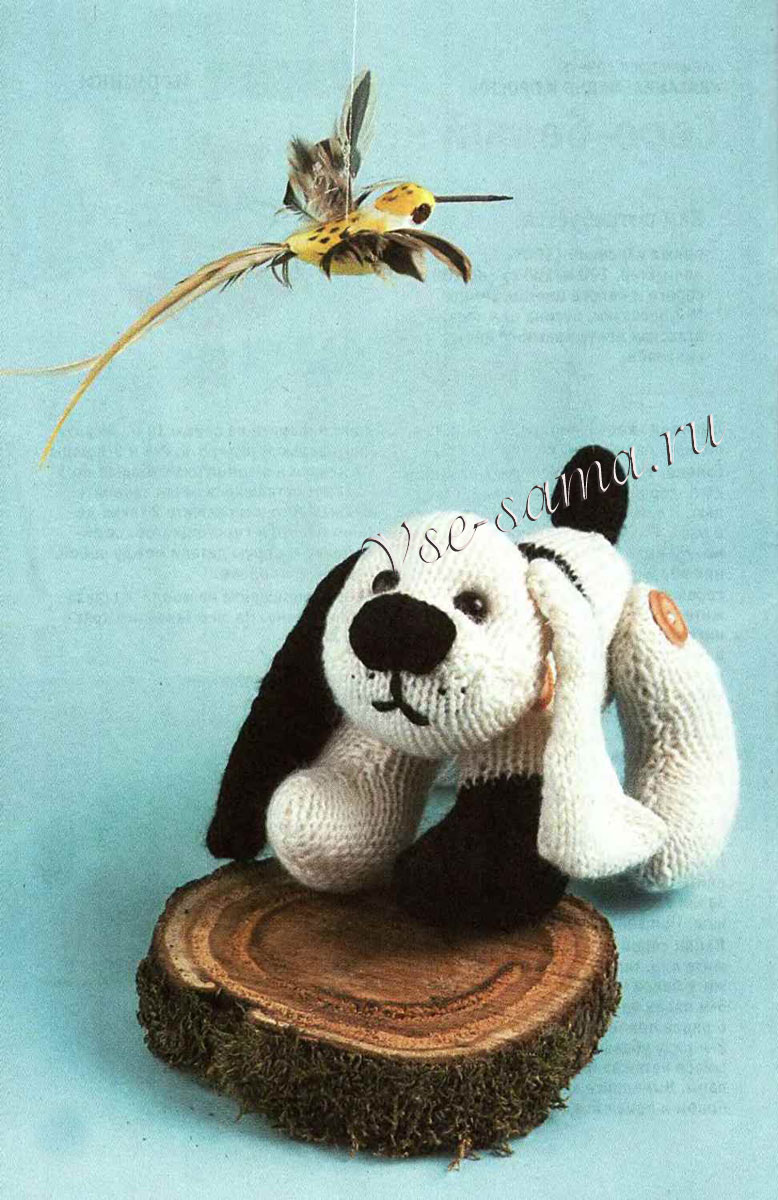 Вязаная игрушка - Собака-охотница Вам потребуется: пряжа «Новозеландская» (100% шерсть, 250 м/100 г) - по 50 г черного и белого цветов, спицы №2,5, синтепон, 4 пуговицы, глазки. Лицевая гладь - лиц. ряды - лиц. петли, изн. ряды - изн. петли. Голова: белой пряжей наберите 10 п., вяжите лиц. гладью. 2 ряда, прибавляя в начале и в конце ряда по 1 п. Далее до 22-го ряда вяжите, прибавляя в каждом 2-м ряду по 1 п. с обеих сторон. Затем до 30-го ряда вяжите прямо. Закройте петли.Нижняя часть головы: белой нитью наберите 8 п., вяжите лиц. гладью 2 ряда прямо. Далее до 22-го ряда вяжите, прибавляя по 1 п. в начале и в конце ряда. Затем до 30-го ряда вяжите прямо. Закройте петли. Туловище: черной нитью наберите 18 п., вяжите лиц. гладью, прибавляя по 1 п. в начале и в конце каждого ряда, до 18-го ряда. В 19-м ряду поменяйте нить на белую и вяжите аналогично до 21-го ряда. Далее до 28-го ряда вяжите прямо. 22-й и 23-й ряды - убавьте в начале и в конце ряда по 1 п. Затем до 35-го ряда вяжите прямо. Закройте петли. Лапы (4 шт. ): свяжите 2 белые и 2 черно-белые детали: половину провяжите черной нитью, затем вяжите белой нитью. Наберите 34 п., вяжите 4 ряда прямо. 5-й ряд - убавьте по 1 п. в начале и в конце ряда. 8-й, 10-й и 12-й ряды - убавьте по 2 п. в начале и в конце ряда. 14-й ряд - убавьте 1 п. Далее до 28-го ряда вяжите прямо. 29-31-й -в начале, середине и конце ряда убавьте по 2 п. Оставшиеся петли закройте. Ухо: свяжите 2 детали: черную и белую. Наберите 10 п., вяжите 2 ряда прямо. Начиная с 3-го ряда прибавляйте по 1 п. в начале и в конце каждого ряда до тех пор, пока на спице не получится 30 п. Далее 6 рядов вяжите прямо. Далее убавляйте петли в начале и в конце каждого ряда, чередуя по 1 п. и по 2 п. Хвост: наберите 4 п., вяжите, прибавляя в каждом ряду по 2 п., до 14-го ряда. Сборка: сшейте все детали, набивая синтепоном (кроме ушей). Пришейте глаза-пуговицы, сильно втягивая в голову шею. Вышейте нос. Пришейте глазки. Пришейте лапы к туловищу, украшая их пуговицами. |