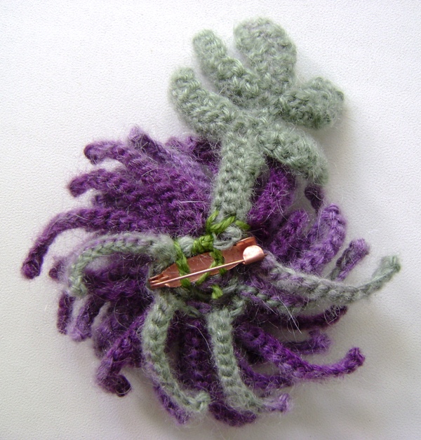Потом вдела в толстую иглу нитку зеленого ириса и собрала цветочек, сшивая по спирали, пришила листик и застежку! Позже наклеила кусочки зеленого фетра и закрыла застежку!