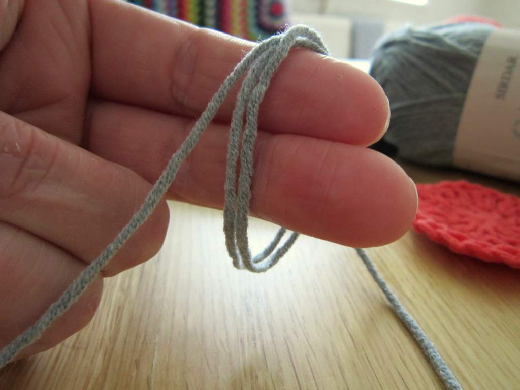 Now with the outer ring colour, make another magic circle. Make the circle by wrapping the yarn twice around your middle fingers - you will need to be able to adjust this magic ring for size later.