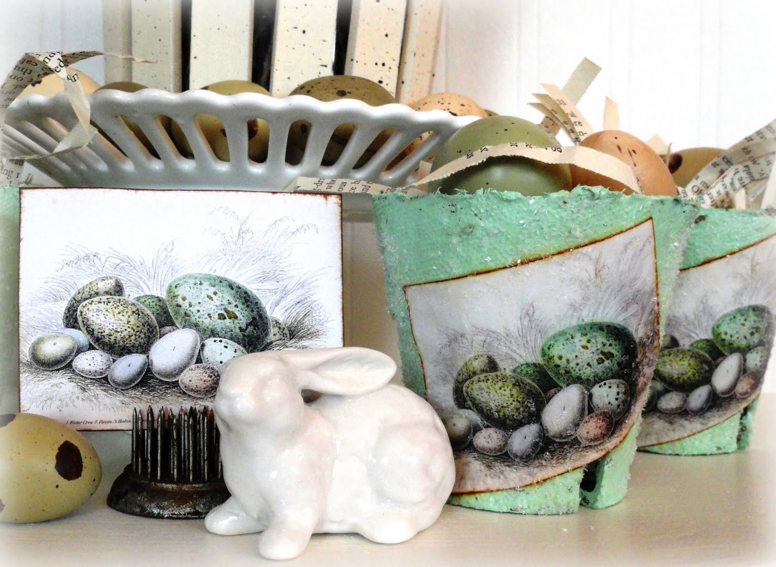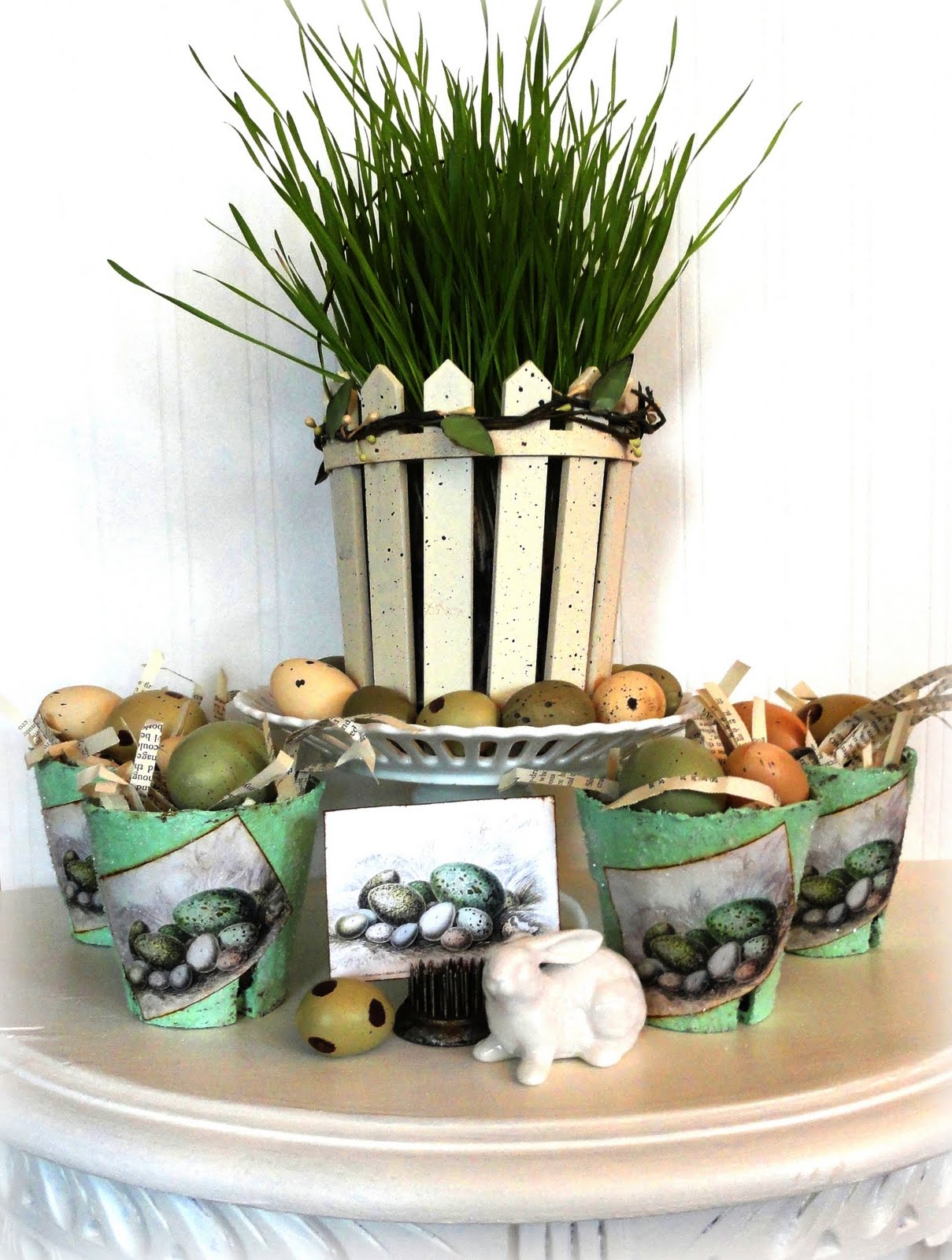 Для создания пасхальных композиций можно с успехом использовать ненужные цветочные горшки. Автор этой работы для декорирования в технике декупаж выбрала торфяные горшочки, покрасила их акриловой краской, нанесла фрагмент и добавила немного блеска. Очень интересная работа:)