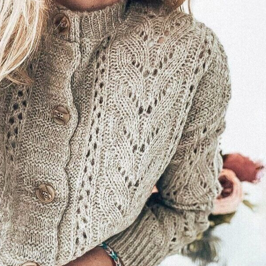 Изделие имеет V-образный вырез горловины, выполнено текстурным узором, узором с косами, проймы обвязаны резинкой. Размеры: S - XXXL  |