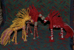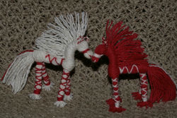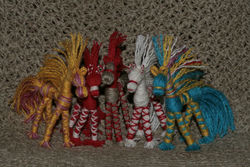 А это коники-мартинички, в предчувствии весны :) У них мордочка по-другому сделана: двуростный пучок перевязан в центре, согнут пополам и перевязана мордочка. Так она получается маленькой, а если перевязывать контрастной ниткой, то коник улыбается :)