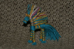 Вот ещё один, с цветной гривой :) У него наконец-то мордочка хорошо получилась - оказывается, надо было оставлять подлиннее конец пучка, чтобы после выворачивания его тоже захватить в перевязь. А я оставляла как можно короче и перевязывала под внутренним узлом, не захватывая его :) Мордочка получалась большеватой (как у жёлтого и льняного коников).