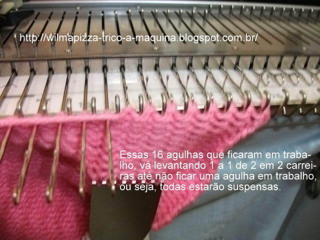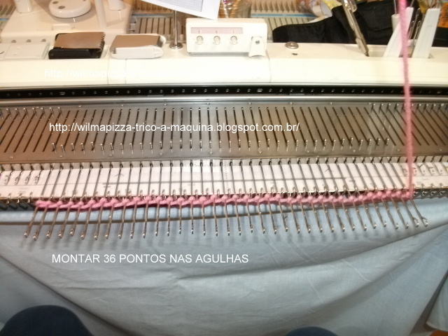 Иглы задвинуть таким образом, чтобы язычки углубились в навешанное полотно. Петли, образованные первым рядом обтачки (после розовой скользкой нити) навесить на иглы