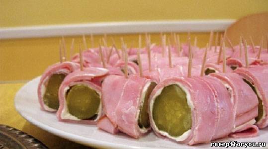 [показать]Ингредиенты: нарезка ветчины, небольшие соленые огурцы, чеснок, плавленый сыр, майонез.