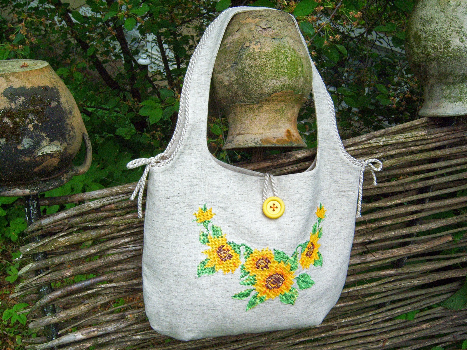 Льняна сумка, прикрашена ручною вишивкою хрестиком.
