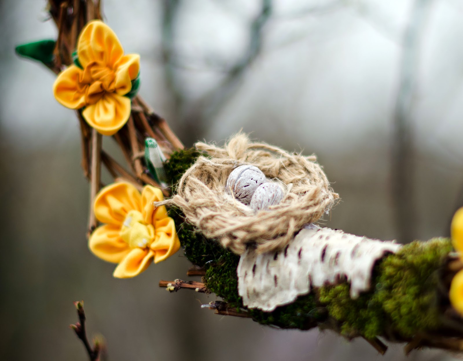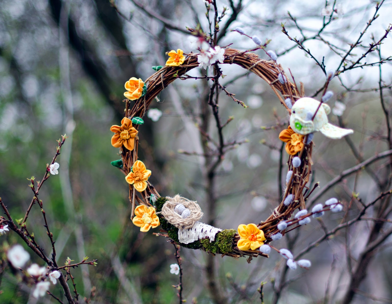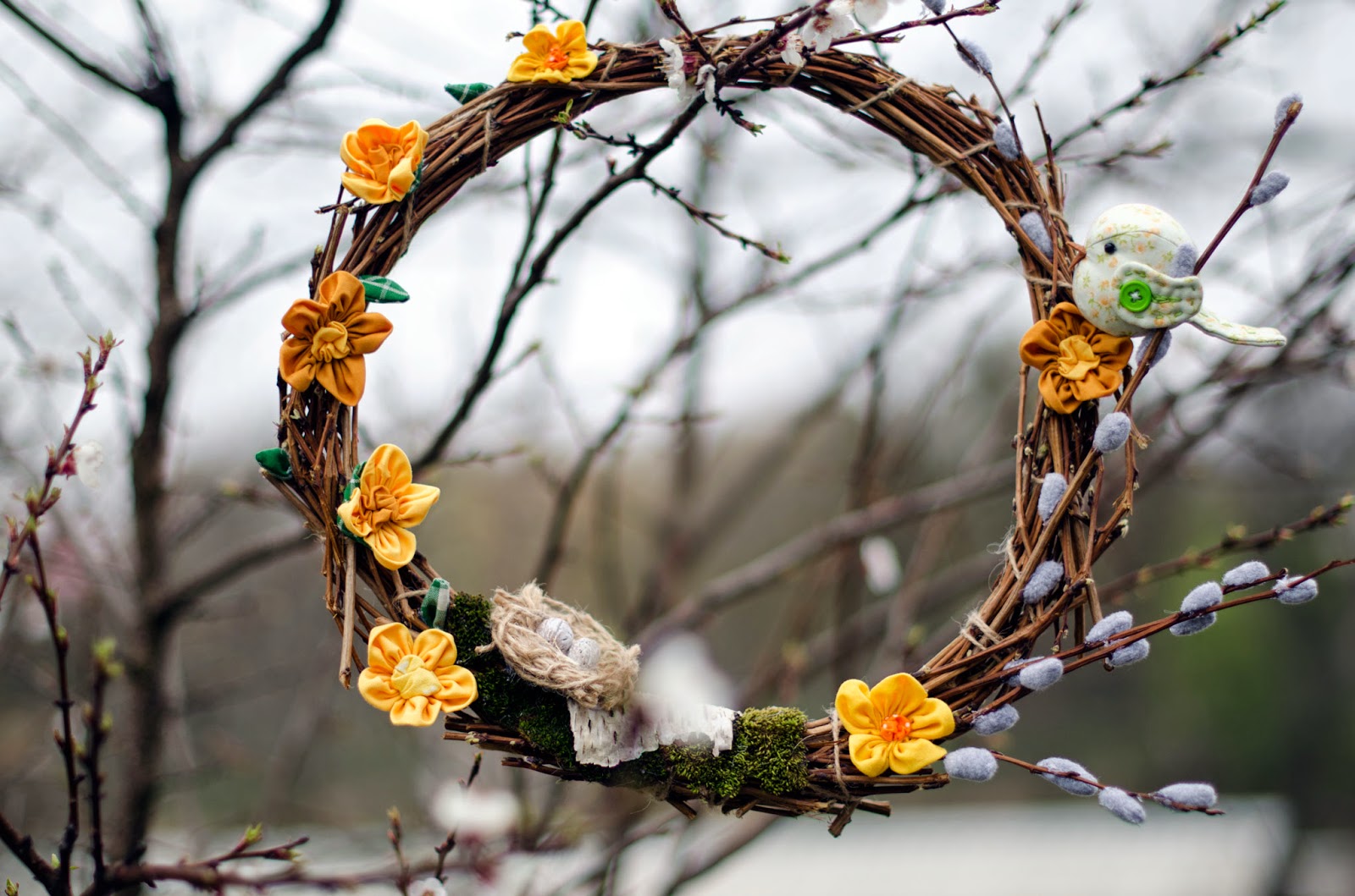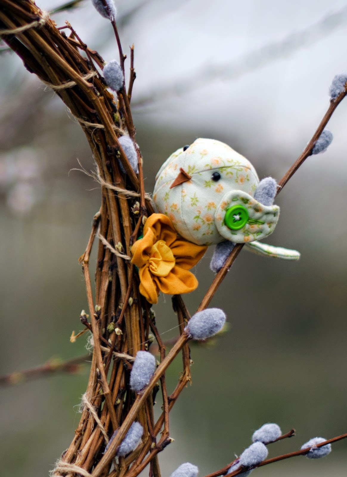 Для декоруу використала власноруч виготовлені гілочки вербових котиків, пташечку, що шила ще на початку весни для фотосесії подушки