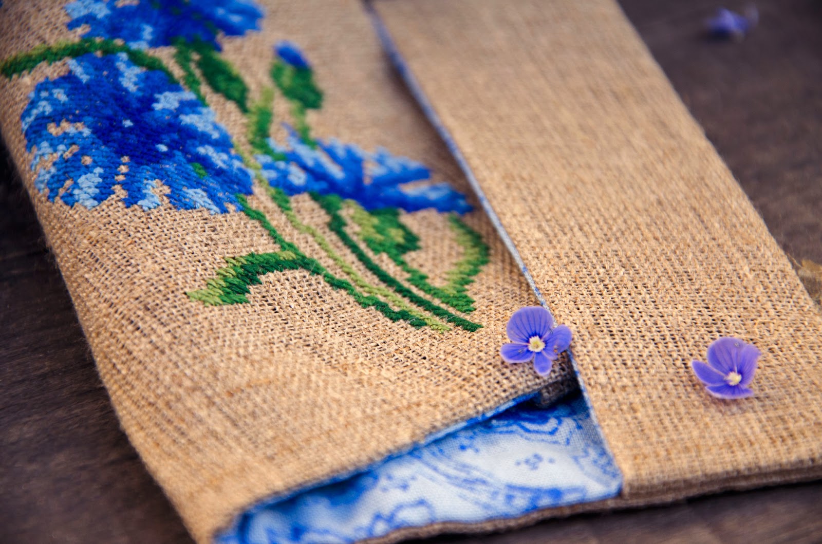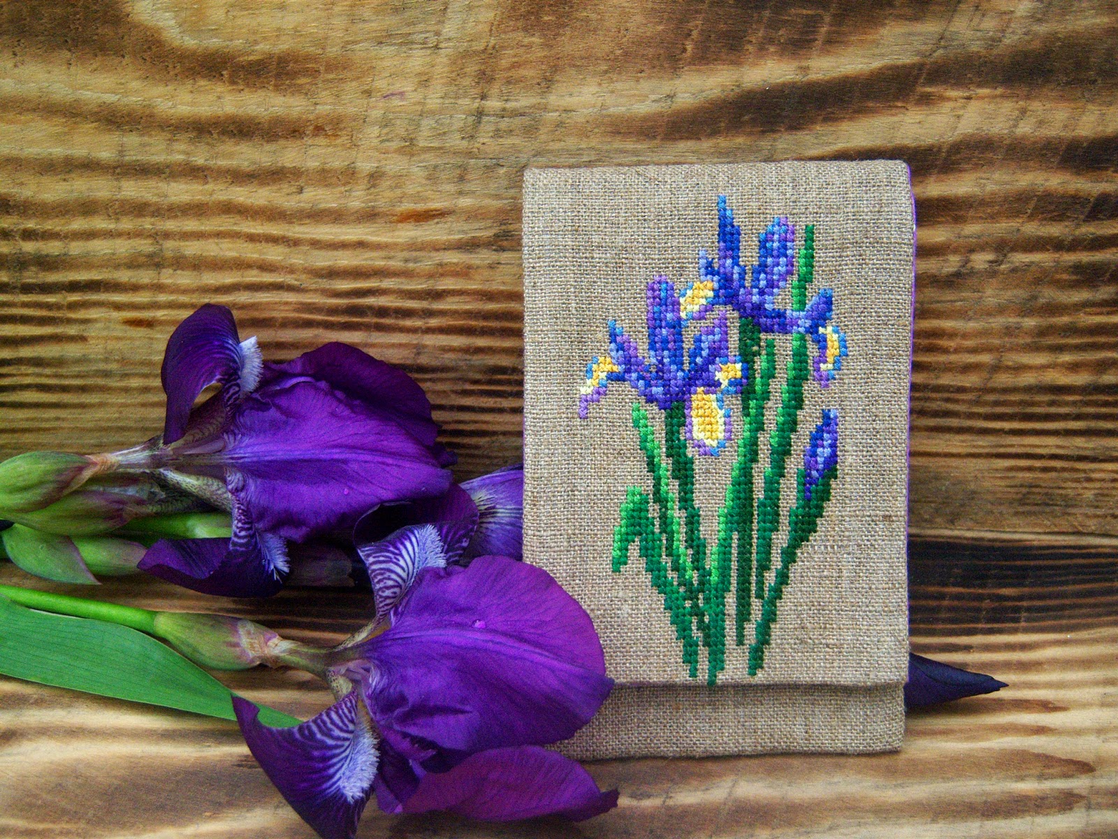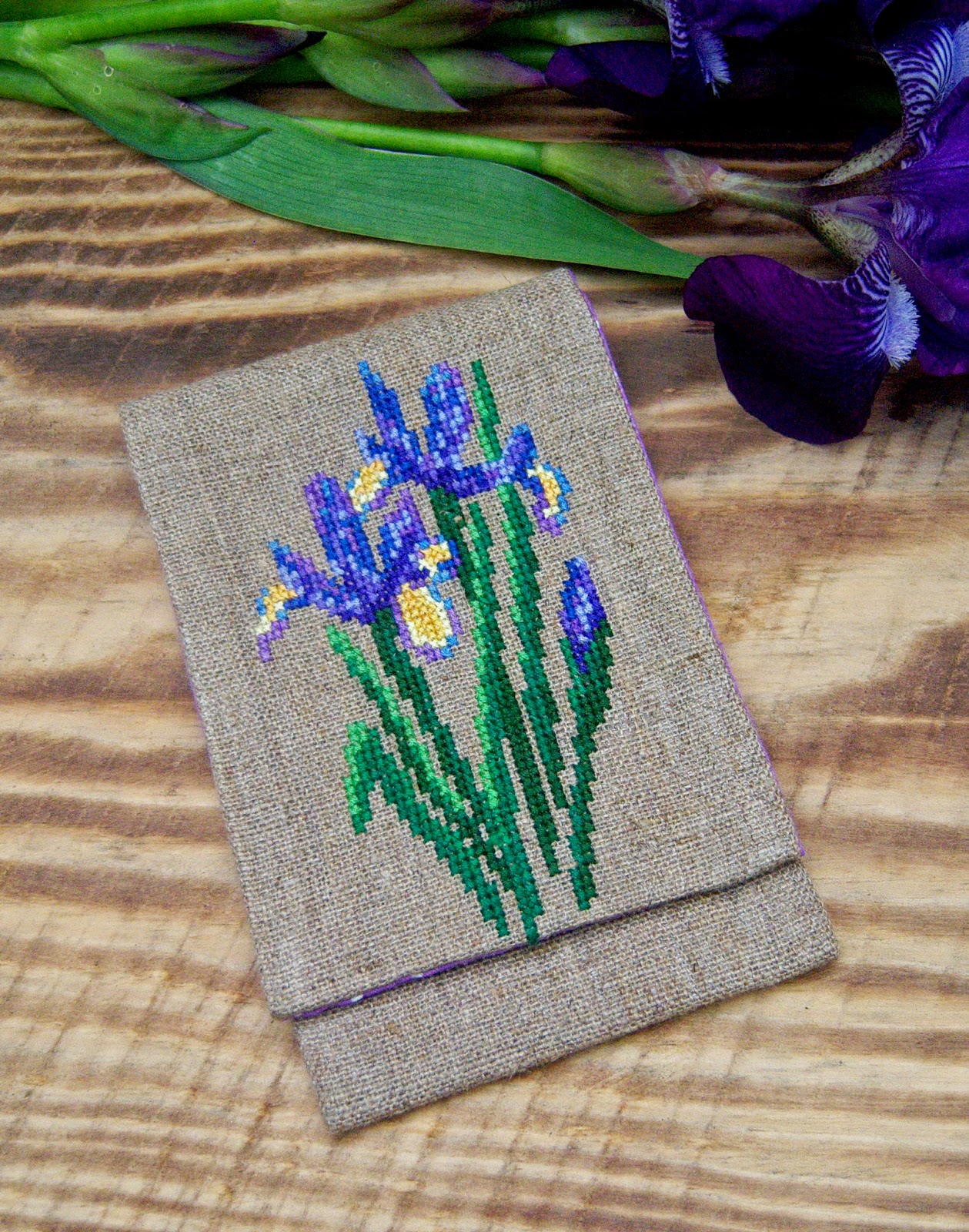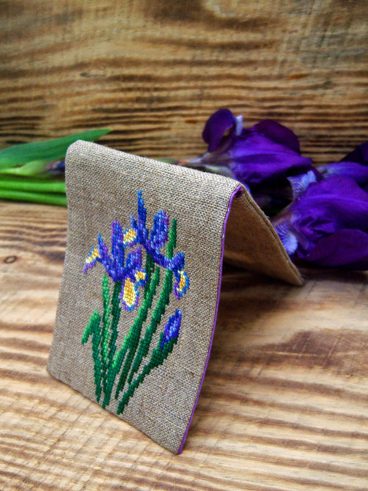 Цьогоріч під час підготовки до ярмарки я таки встигла сфотографувати кілька квіткових робіт в пору цвітіння самих квітів. Однією з цих робіт став чохол для телефона з ірисами