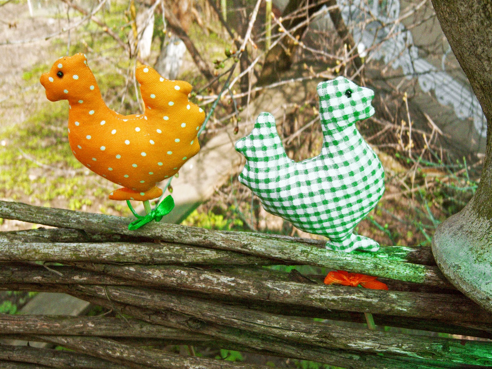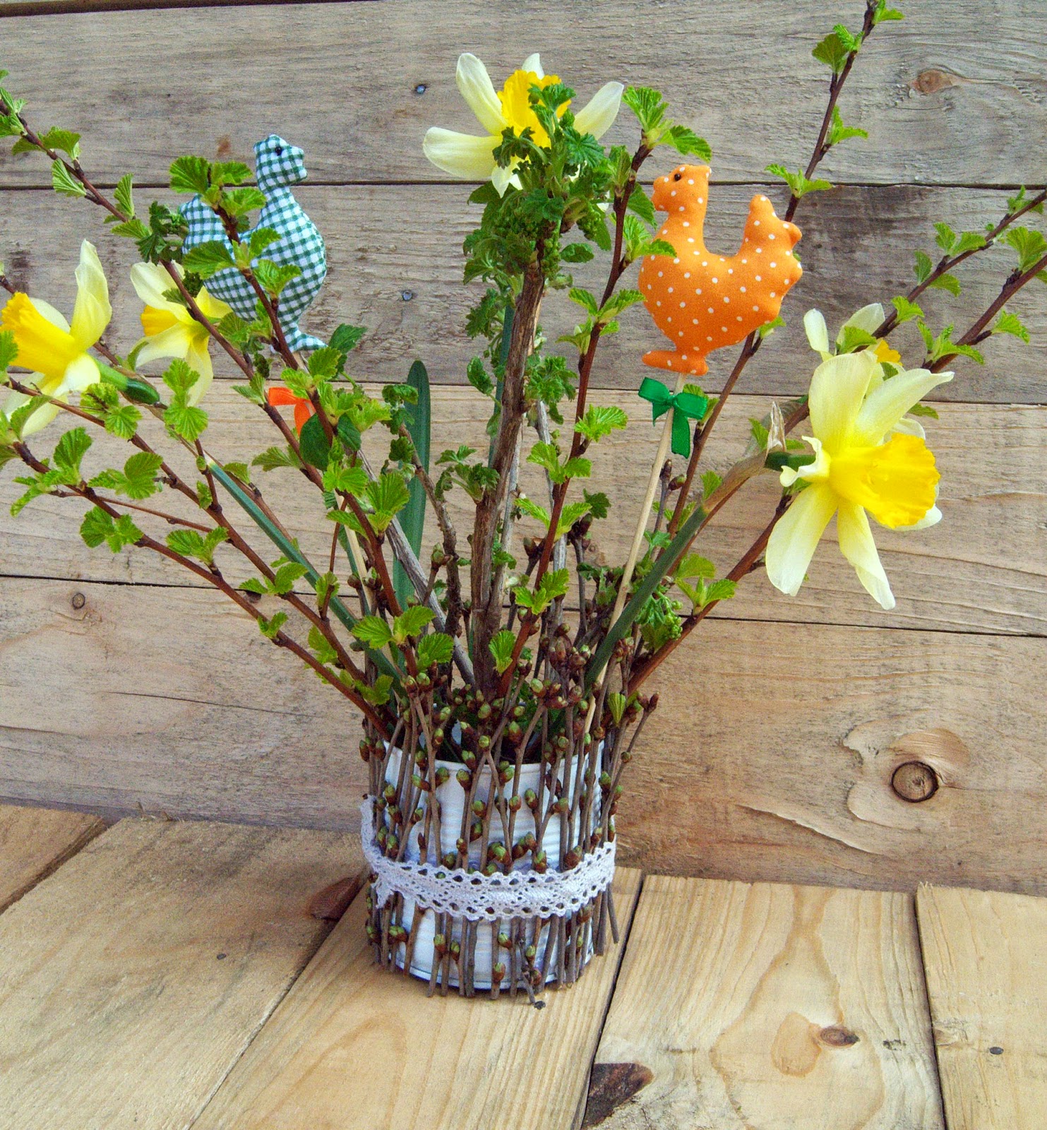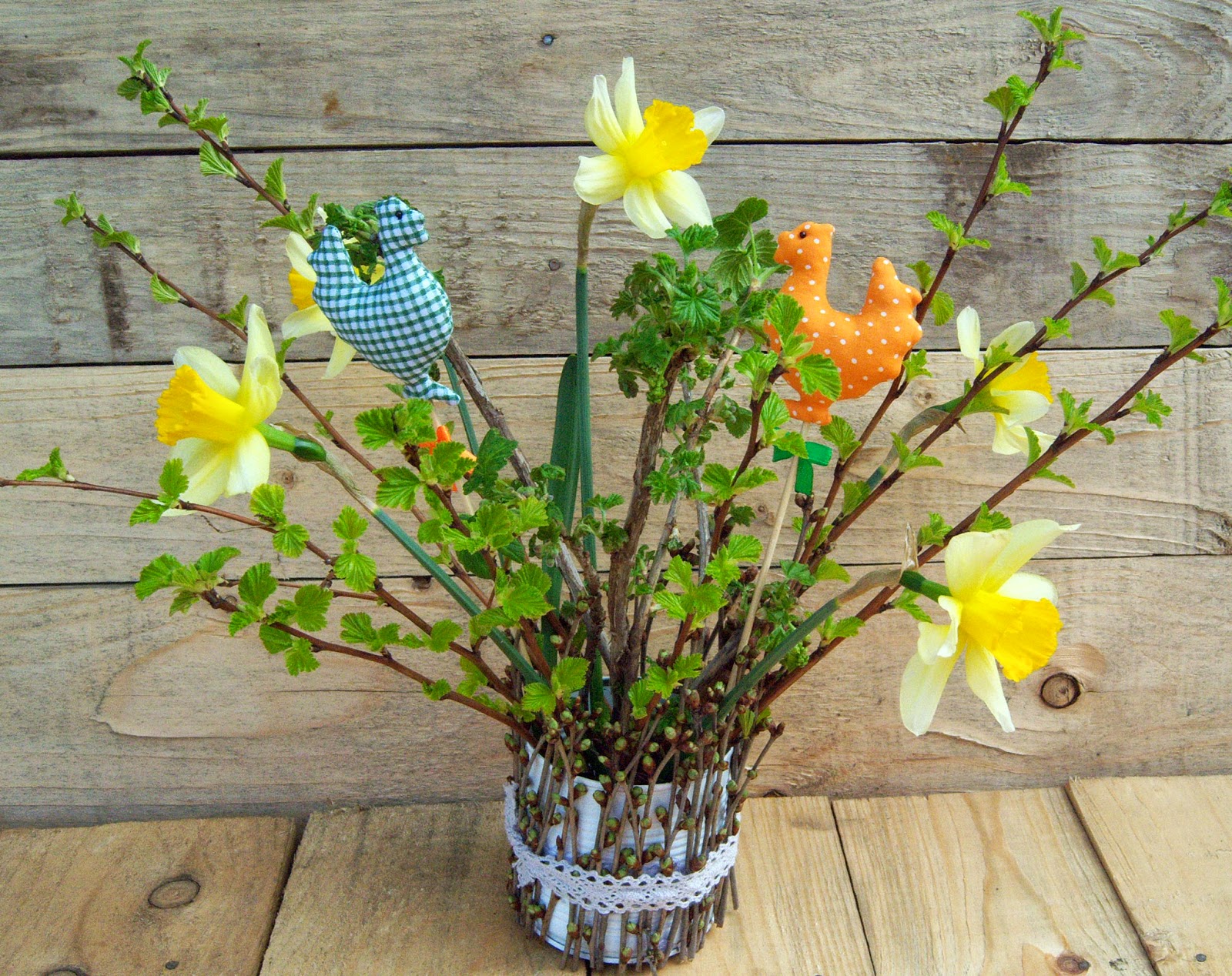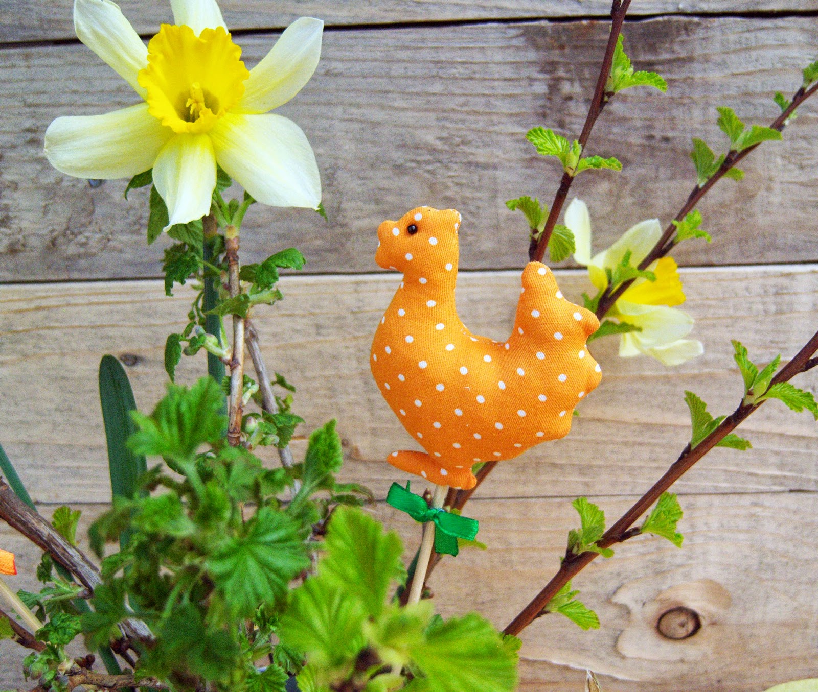 А потім - кілька гілочок смородини, ще якісь напіврозпущені гіллячки невідомого корча :-), букетик подарованих жовтих нарцисів - і декор готовий :-) І курочки, звичайно :-) Хто їх ще цієї весни не шив? признавайтесь :-)