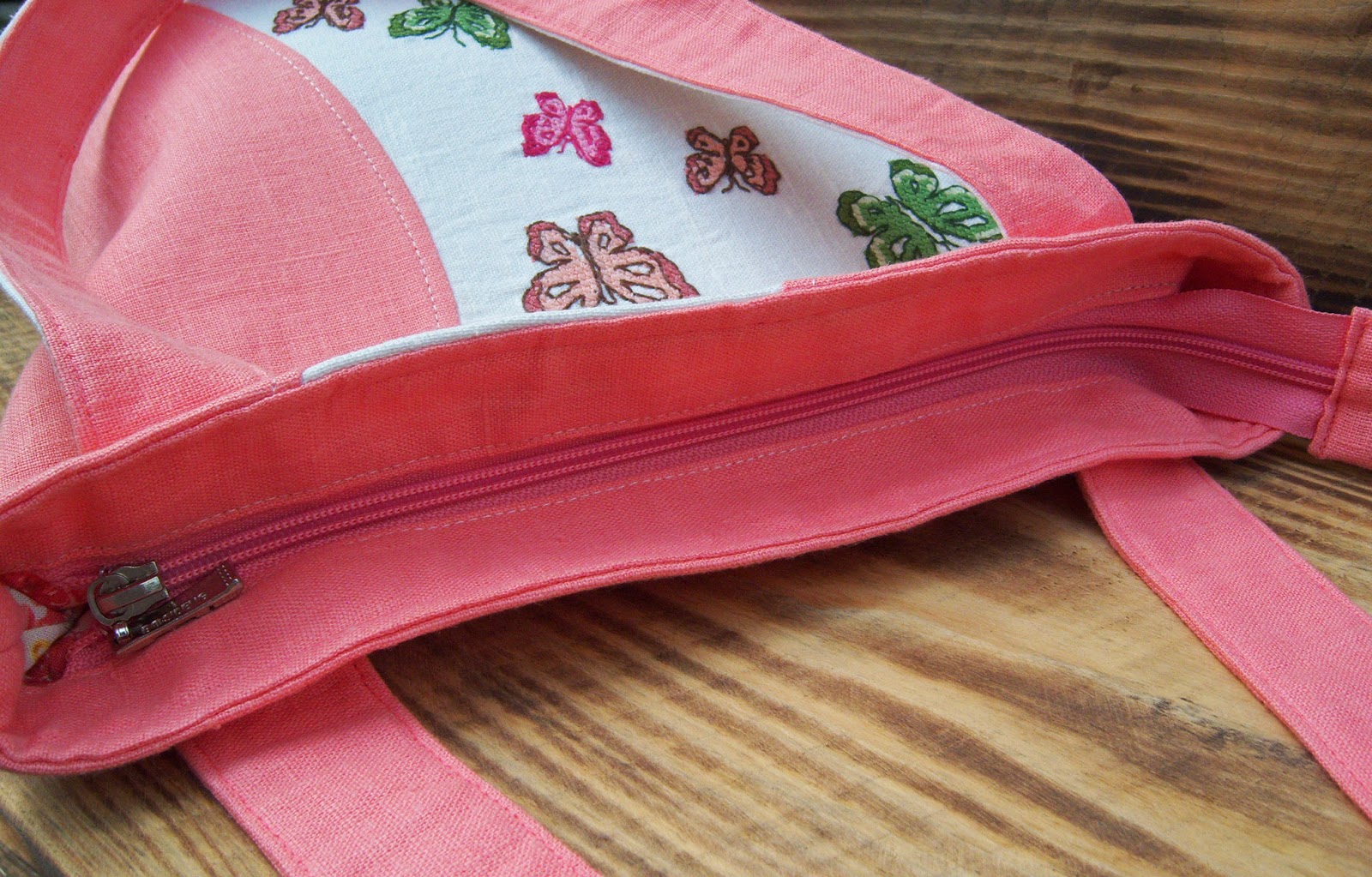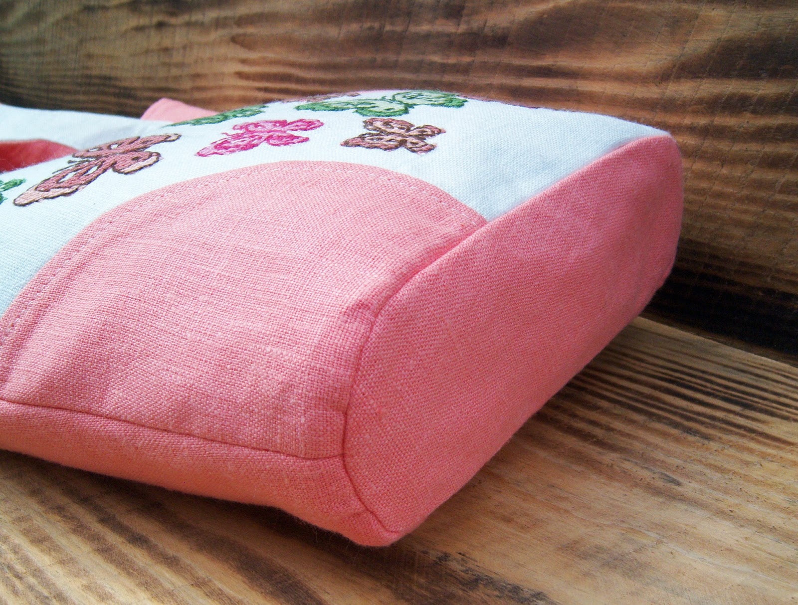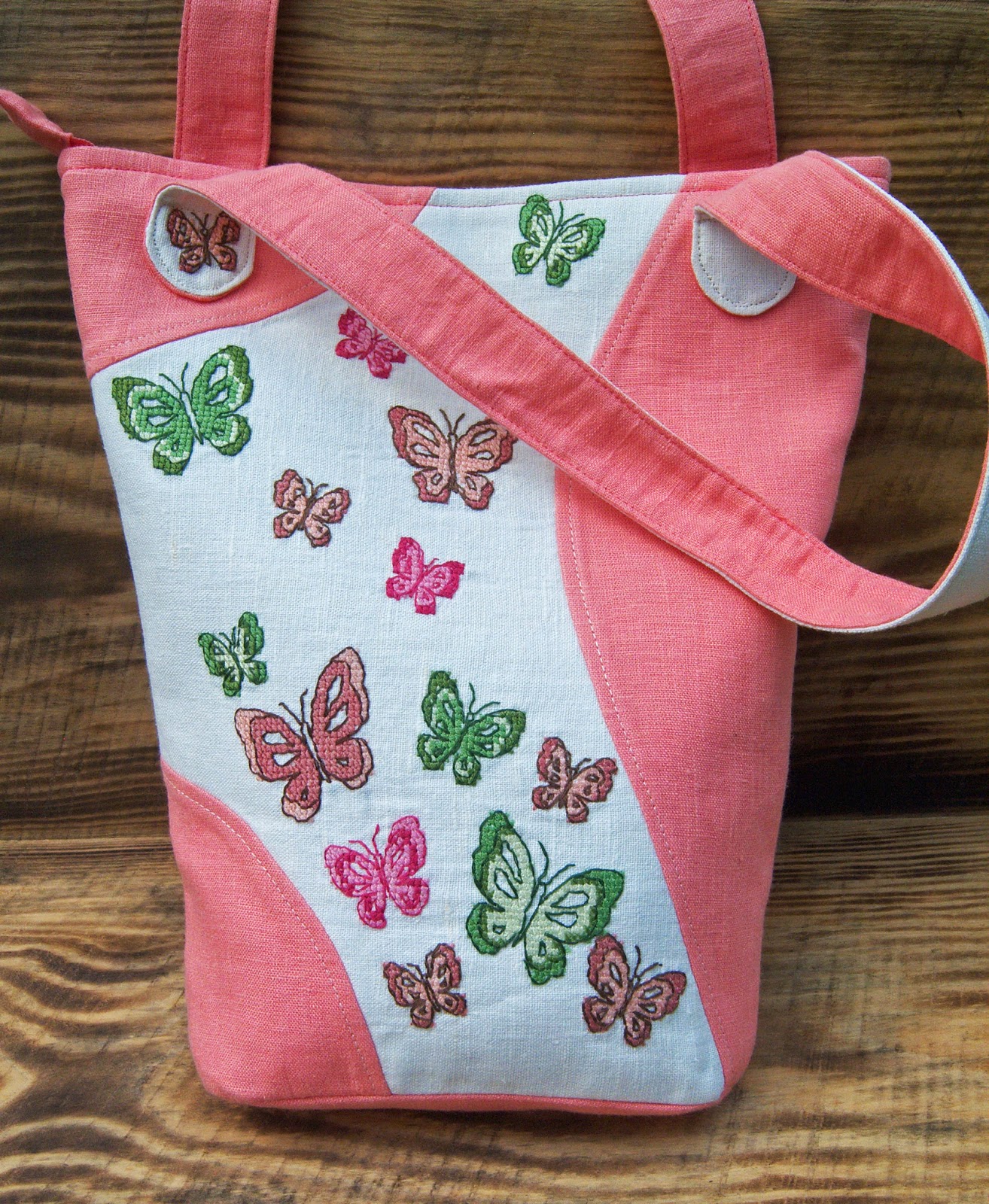 Світла ллляна сумка в формі трапеції, прикрашена ручною вишивкою хрестиком. Колір основної тканини швидше кораловий, аніж рожевий