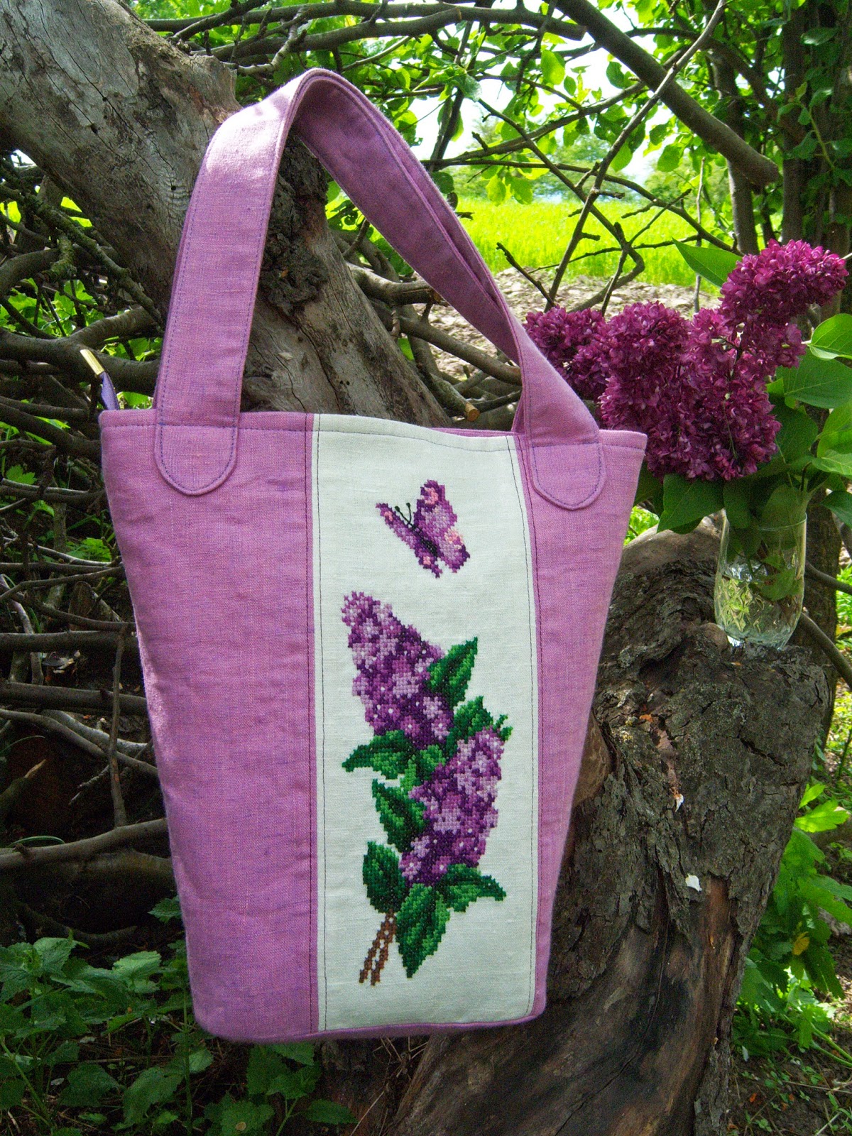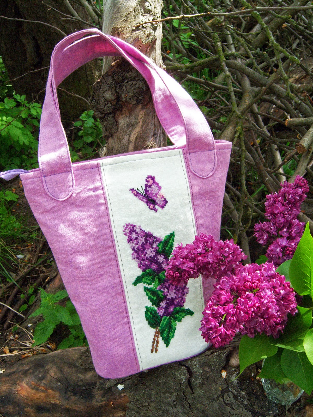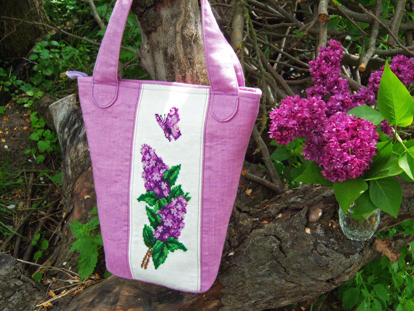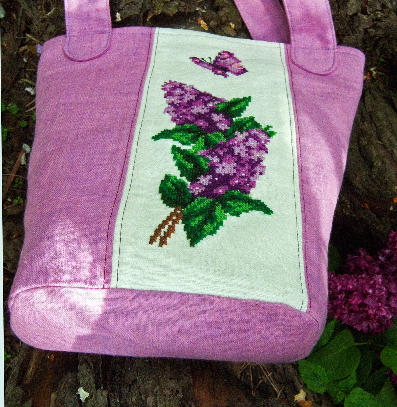 Світла ллляна сумка в формі трапеції, прикрашена ручною вишивкою хрестиком. Колір основної тканини швидше кораловий, аніж рожевий
