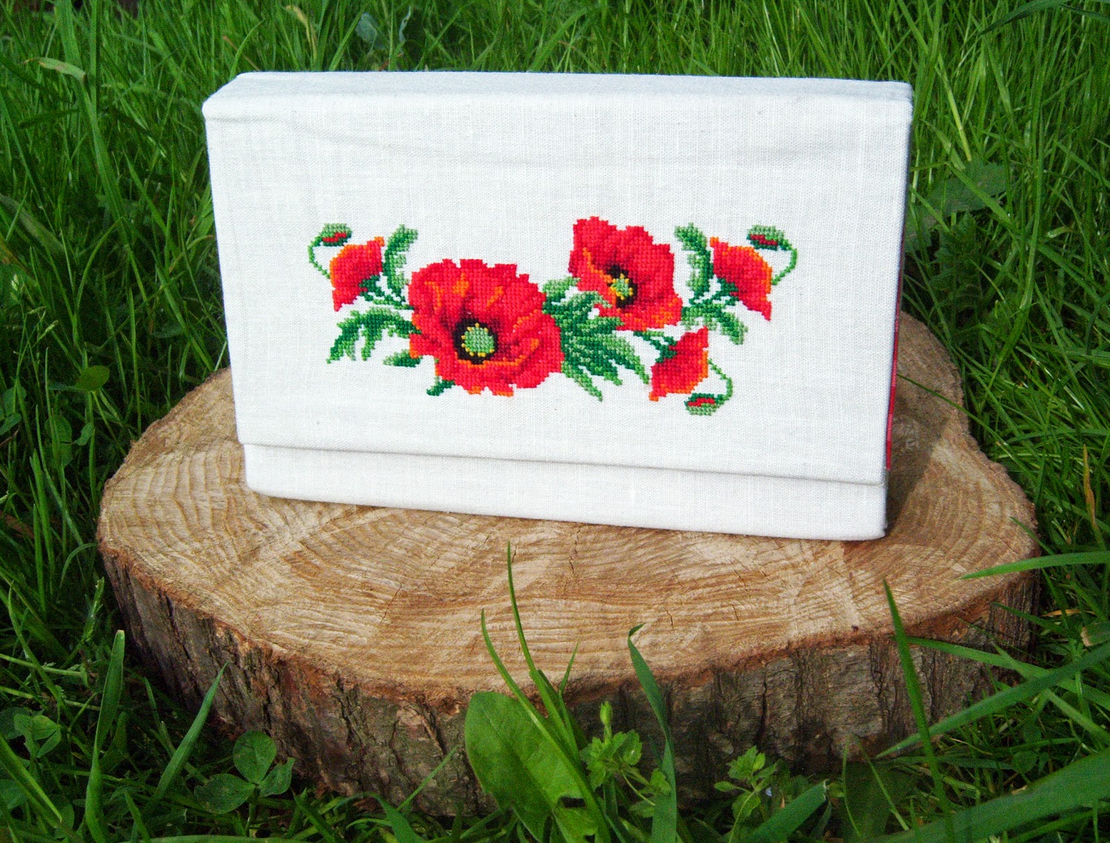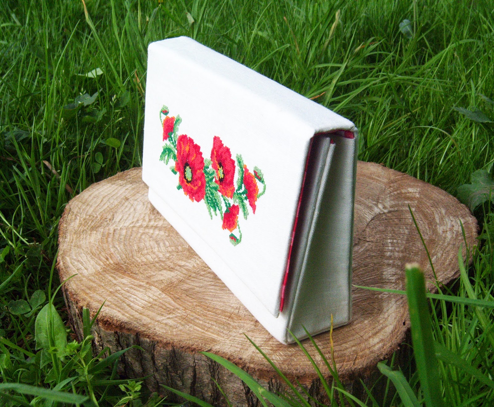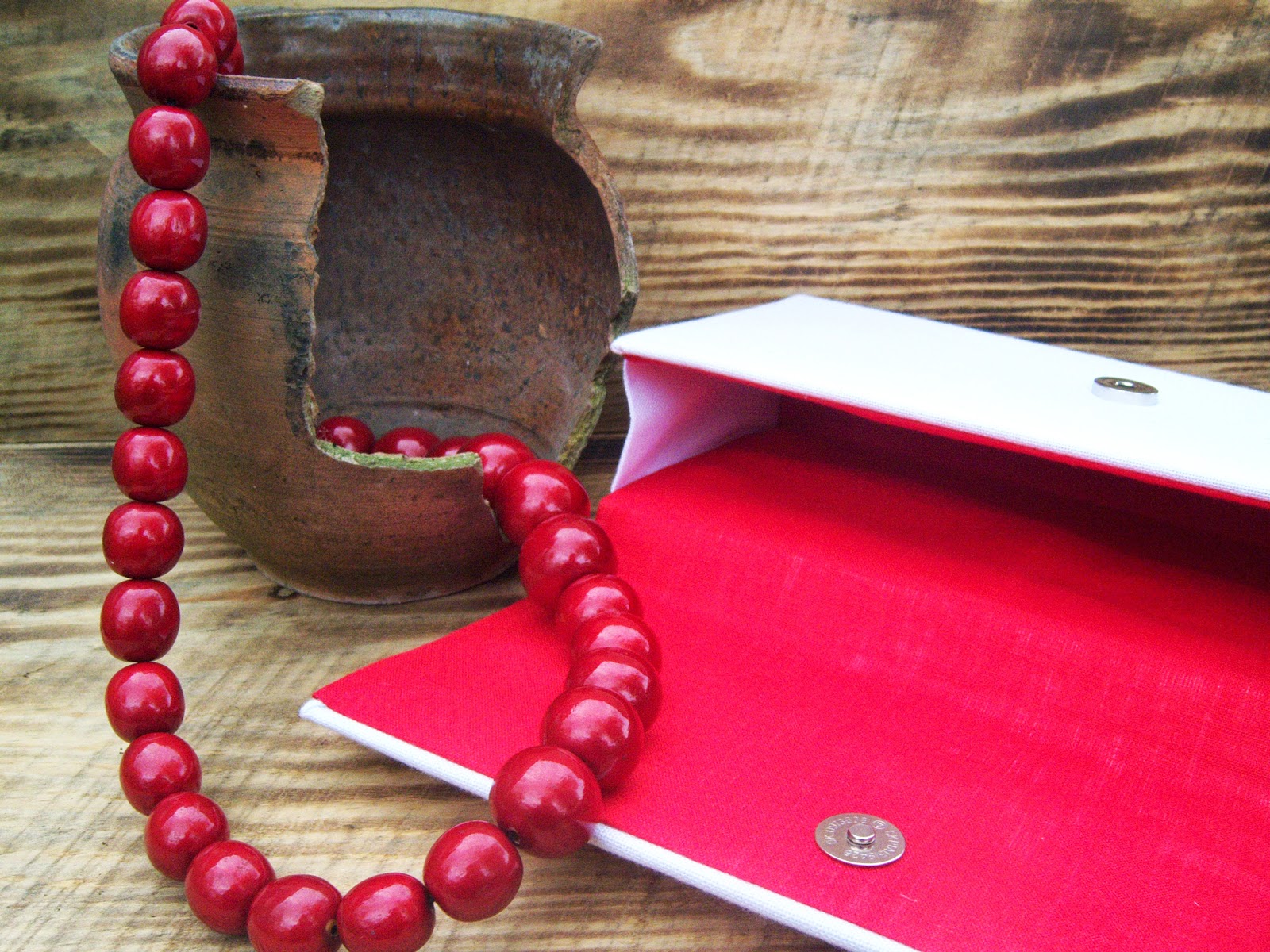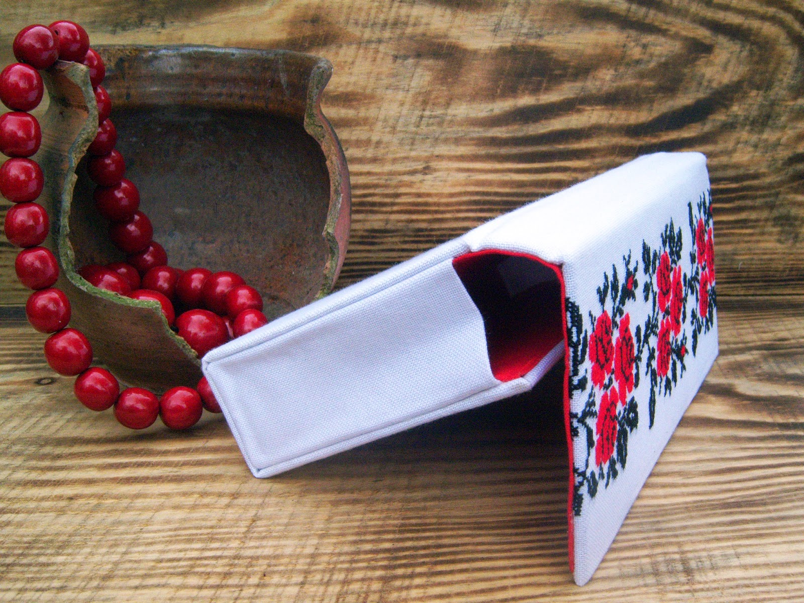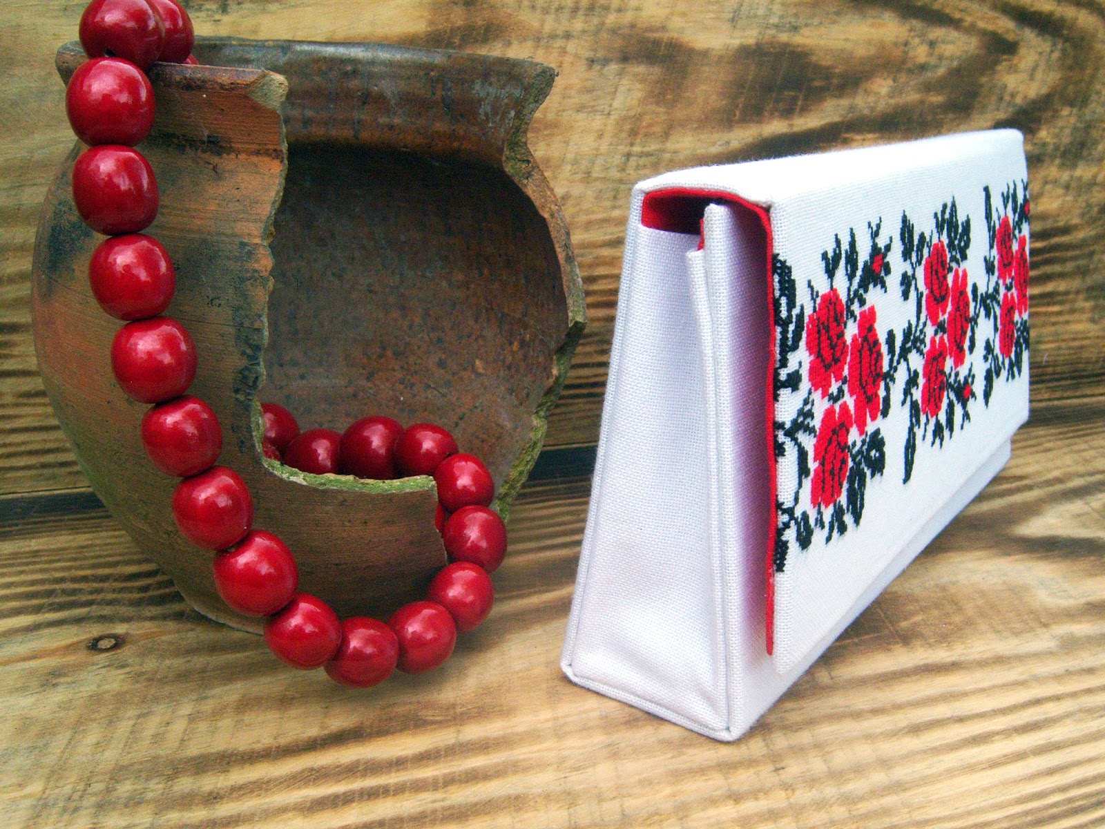 Виготовлений у техніці картонаж, тому відмінно тримає форму. Застібка - магнітна кнопка на клапані. Яскрава лляна середина червоного кольору врівноважує білосніжний верх