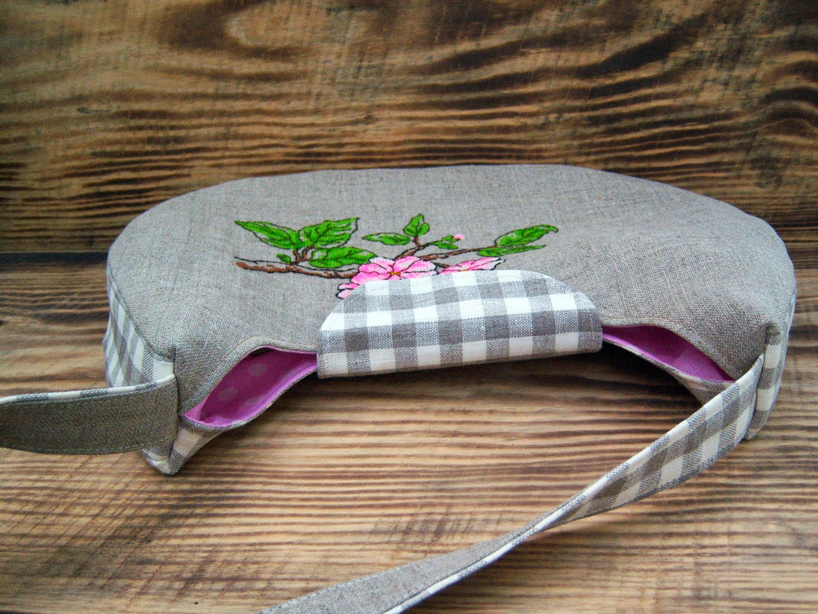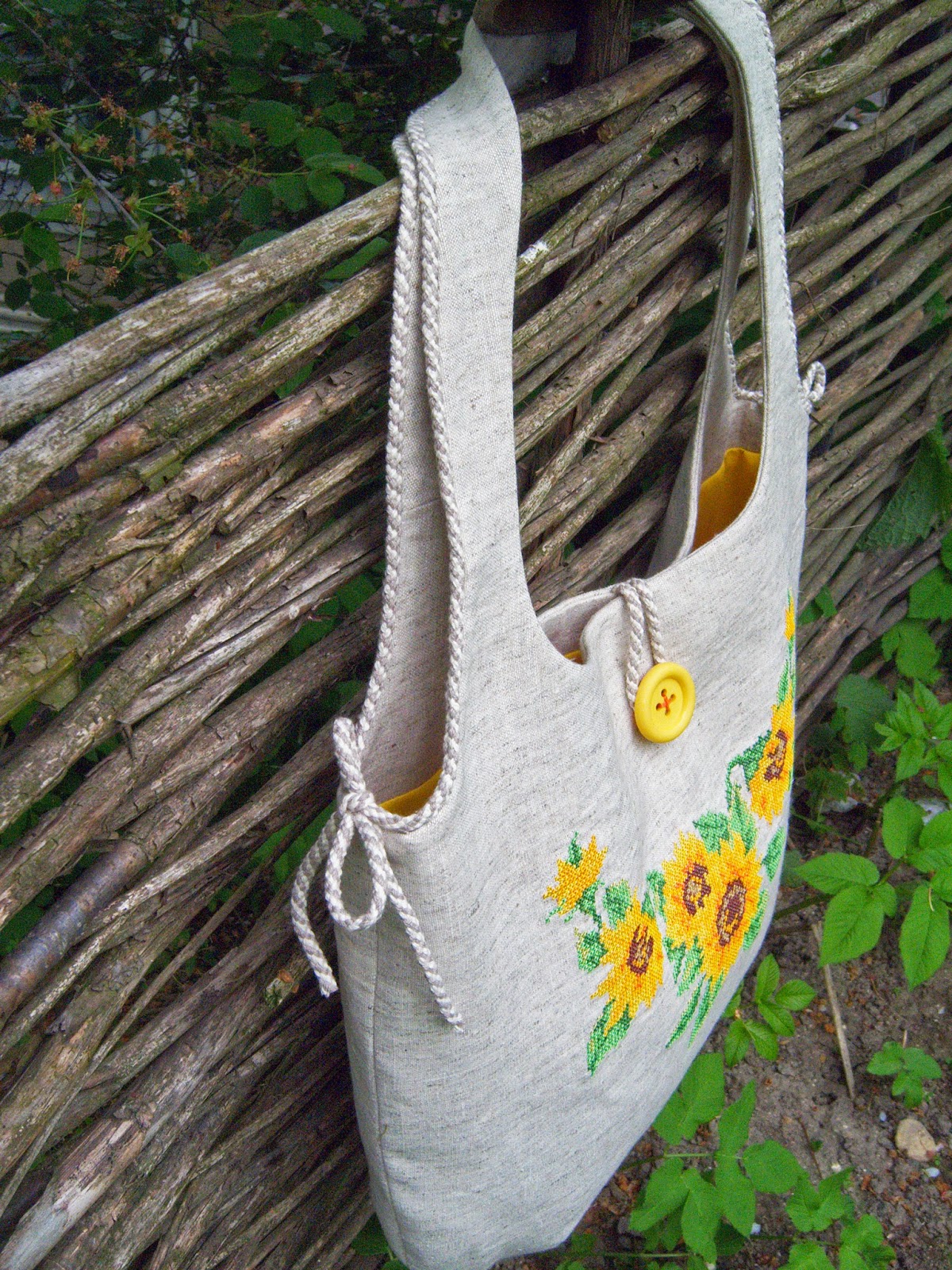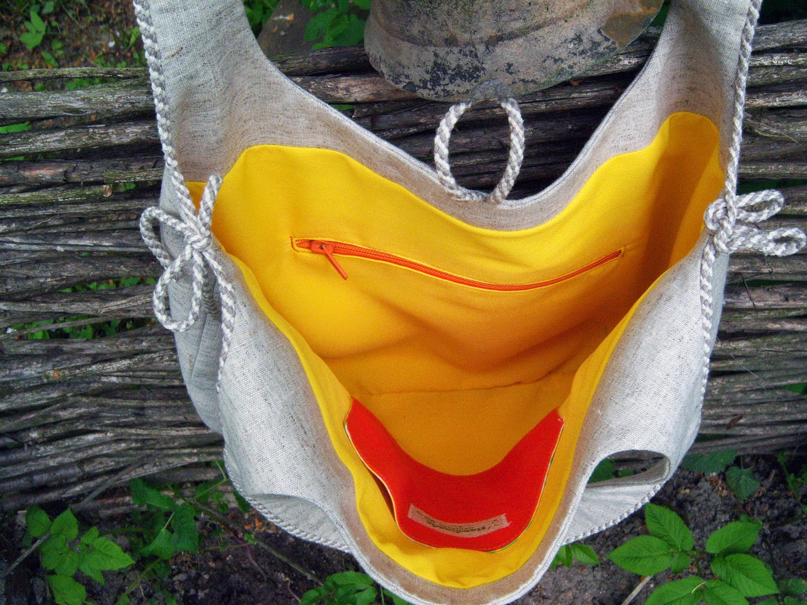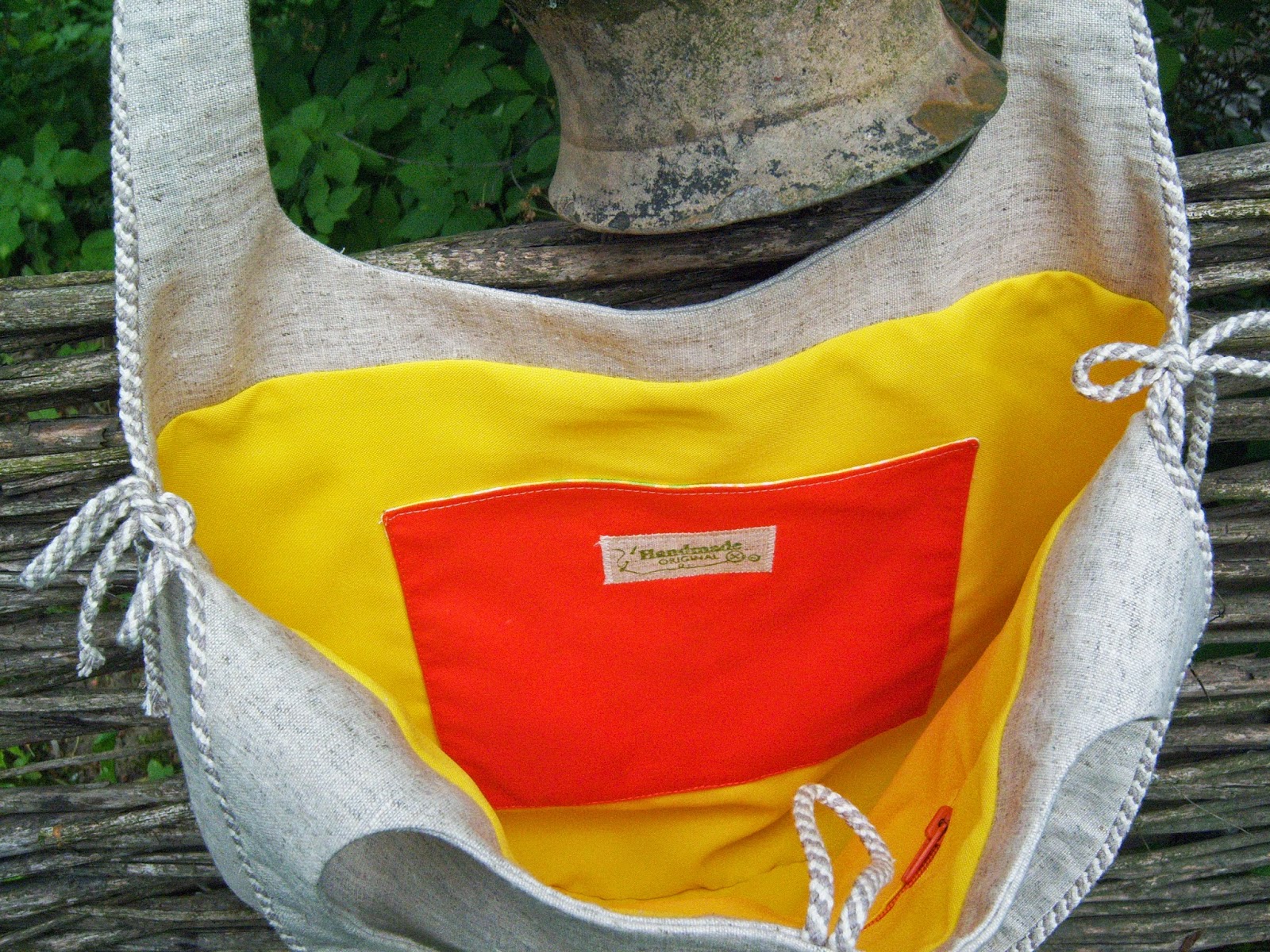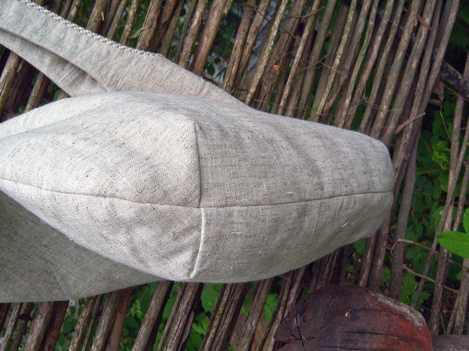 Проте, цього разу, тут є власна "ізюминка" - лляний шнур, пришитий по контуру ручок, який зав'язується по боках сумочки (до слова, зав'язувати його можна на свій смак :-))