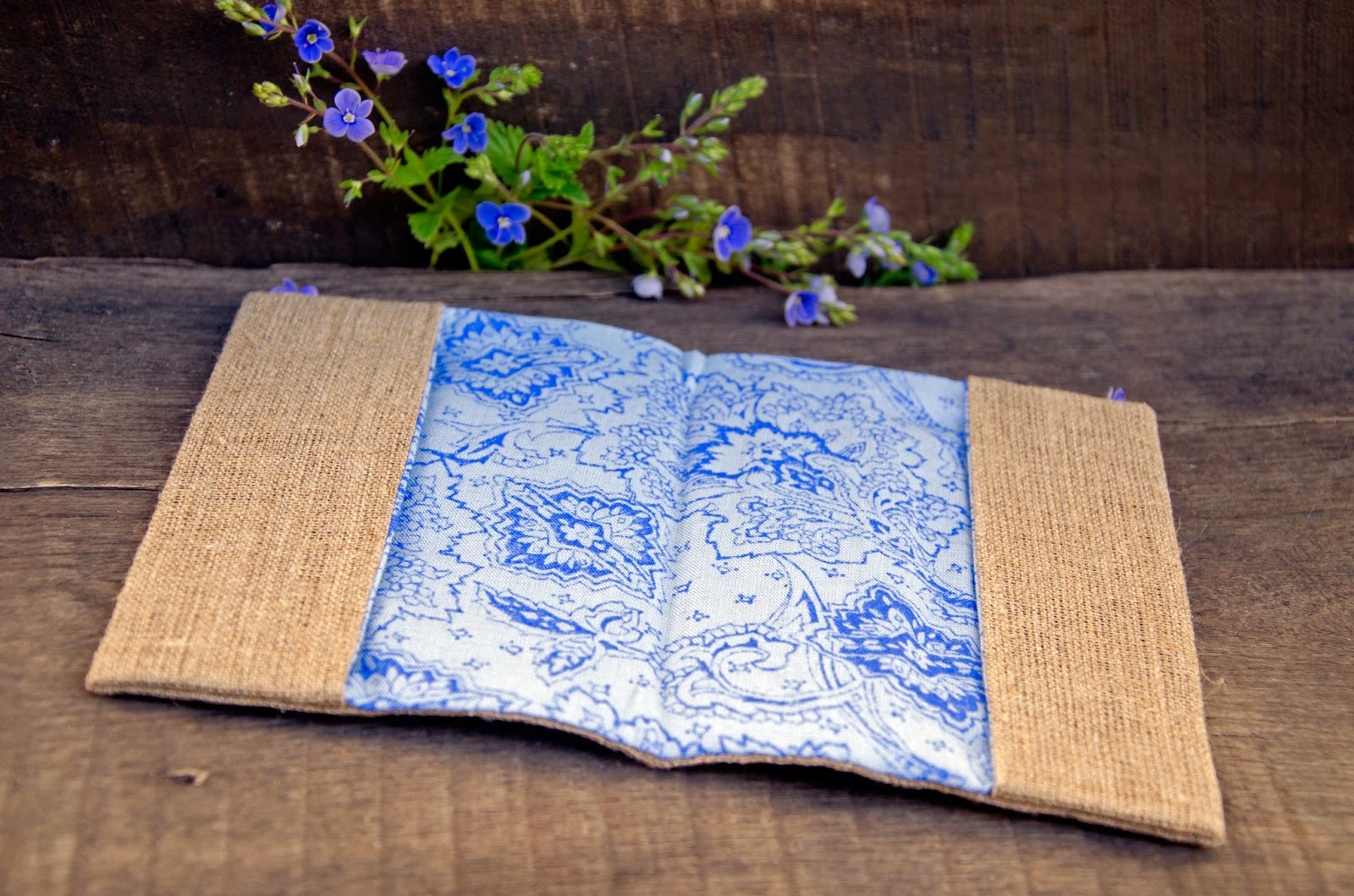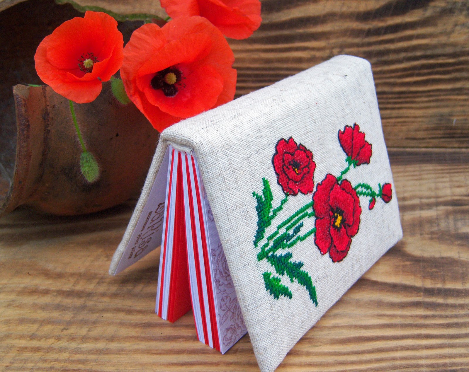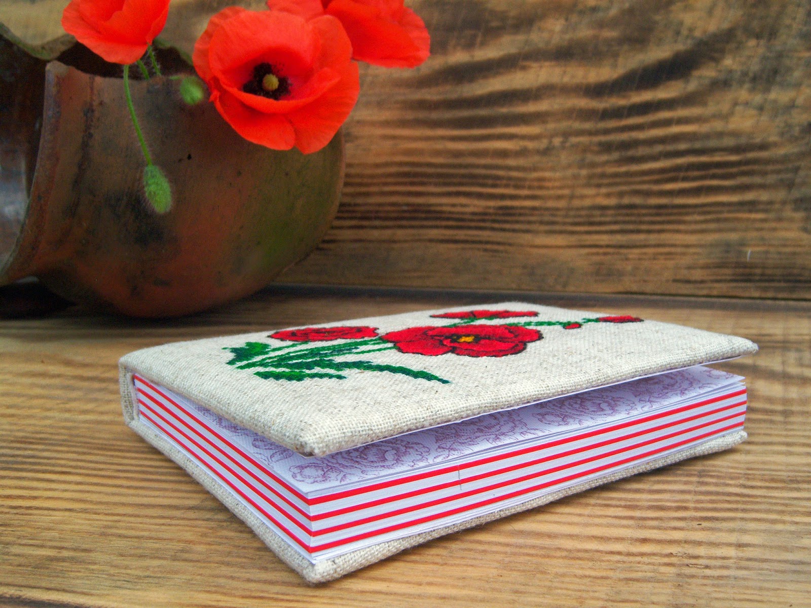 Блокнот виготовлений "з нуля". Обкладинка з палітурного картону, з синтапоновою прослойкою, обтягнута тканиною. Передній форзац квітковий, задній - чисто білий.