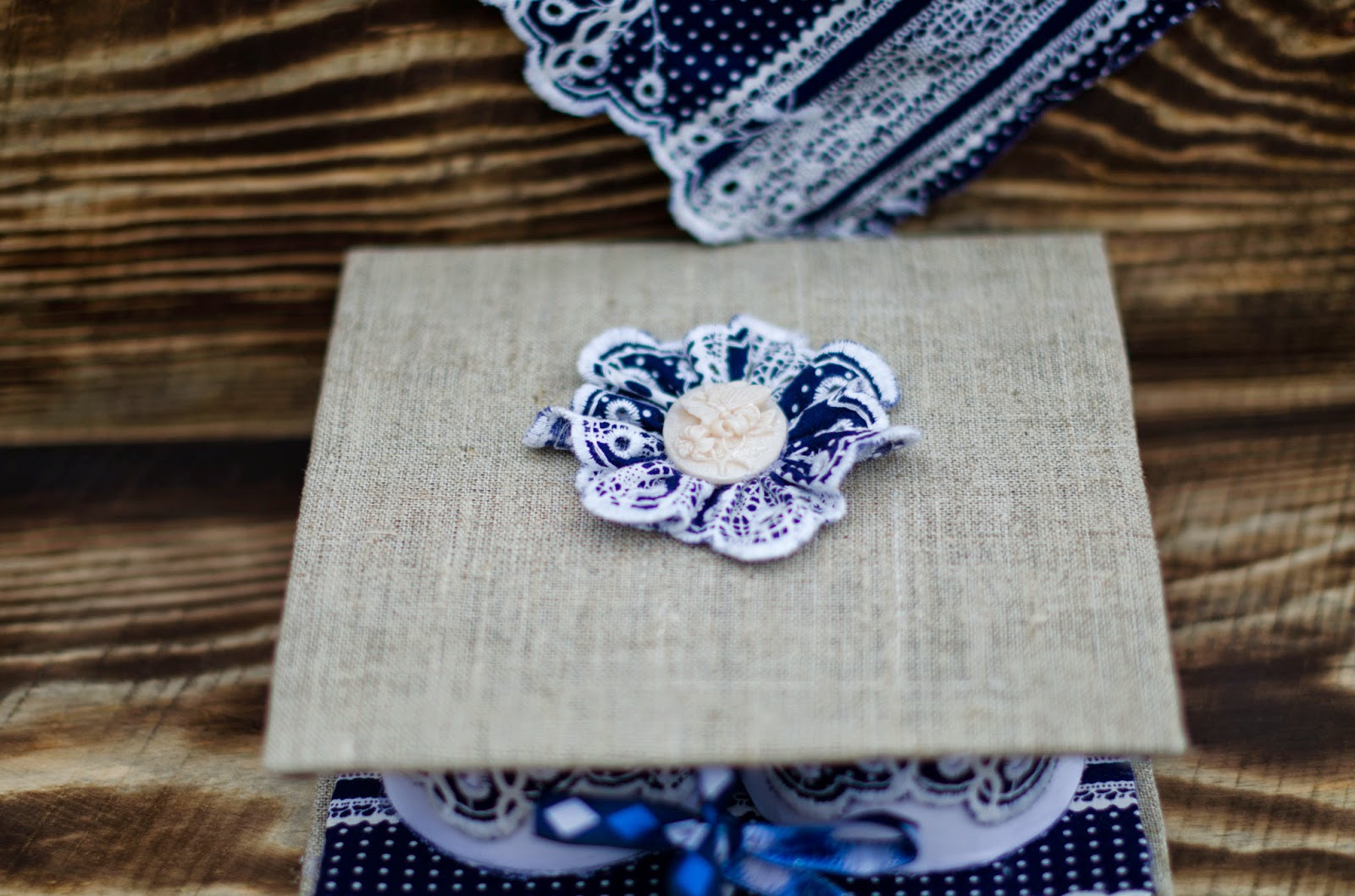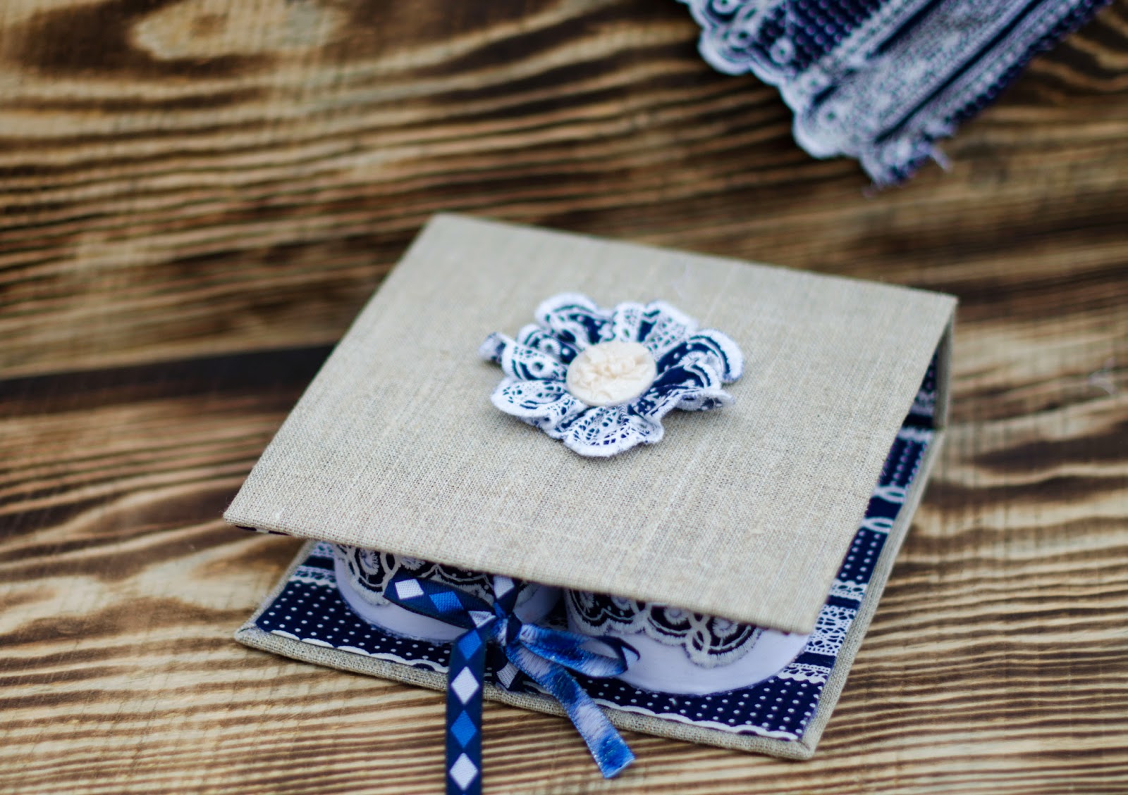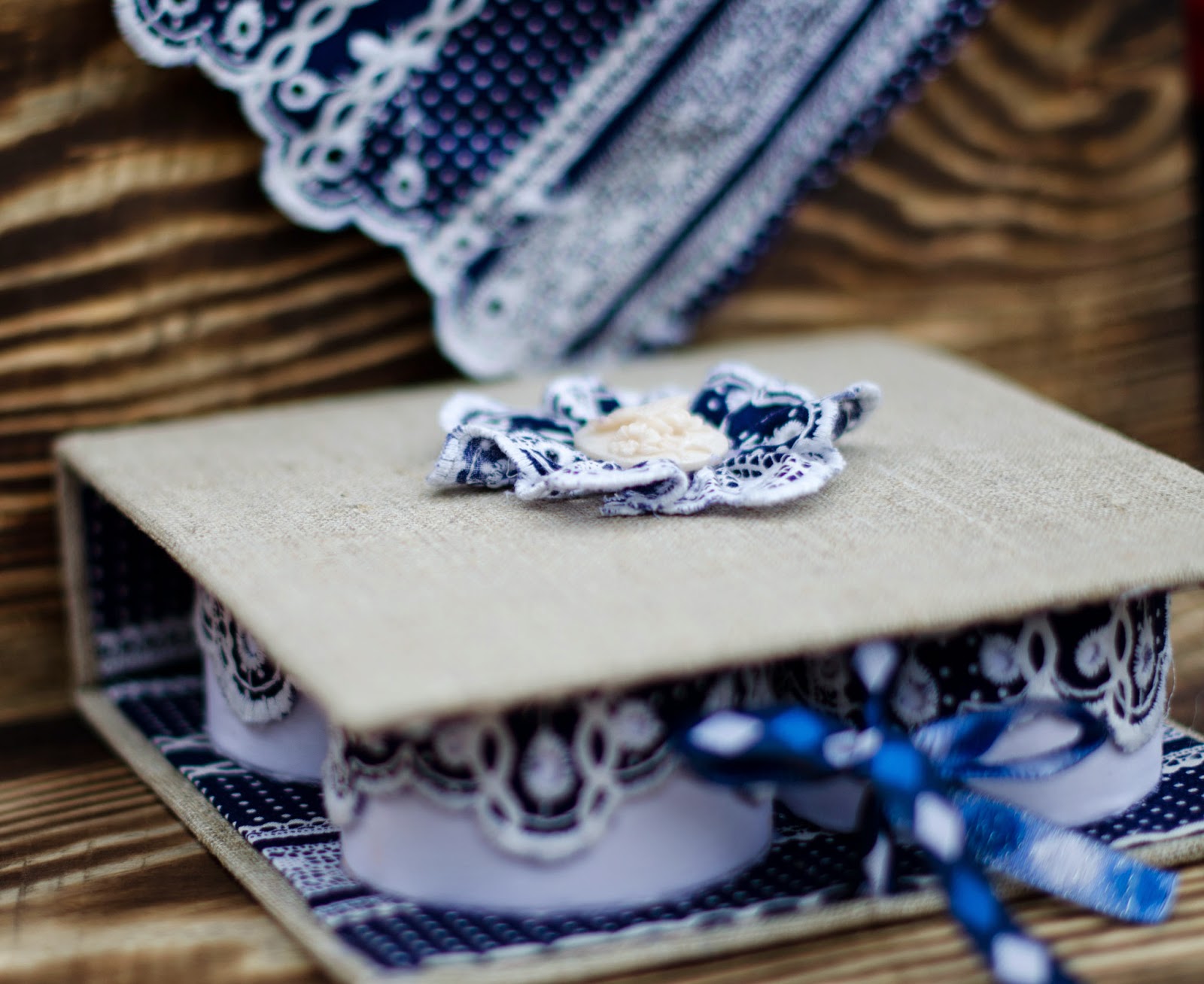 на кришці "брошка" з мережива та "камеї"
