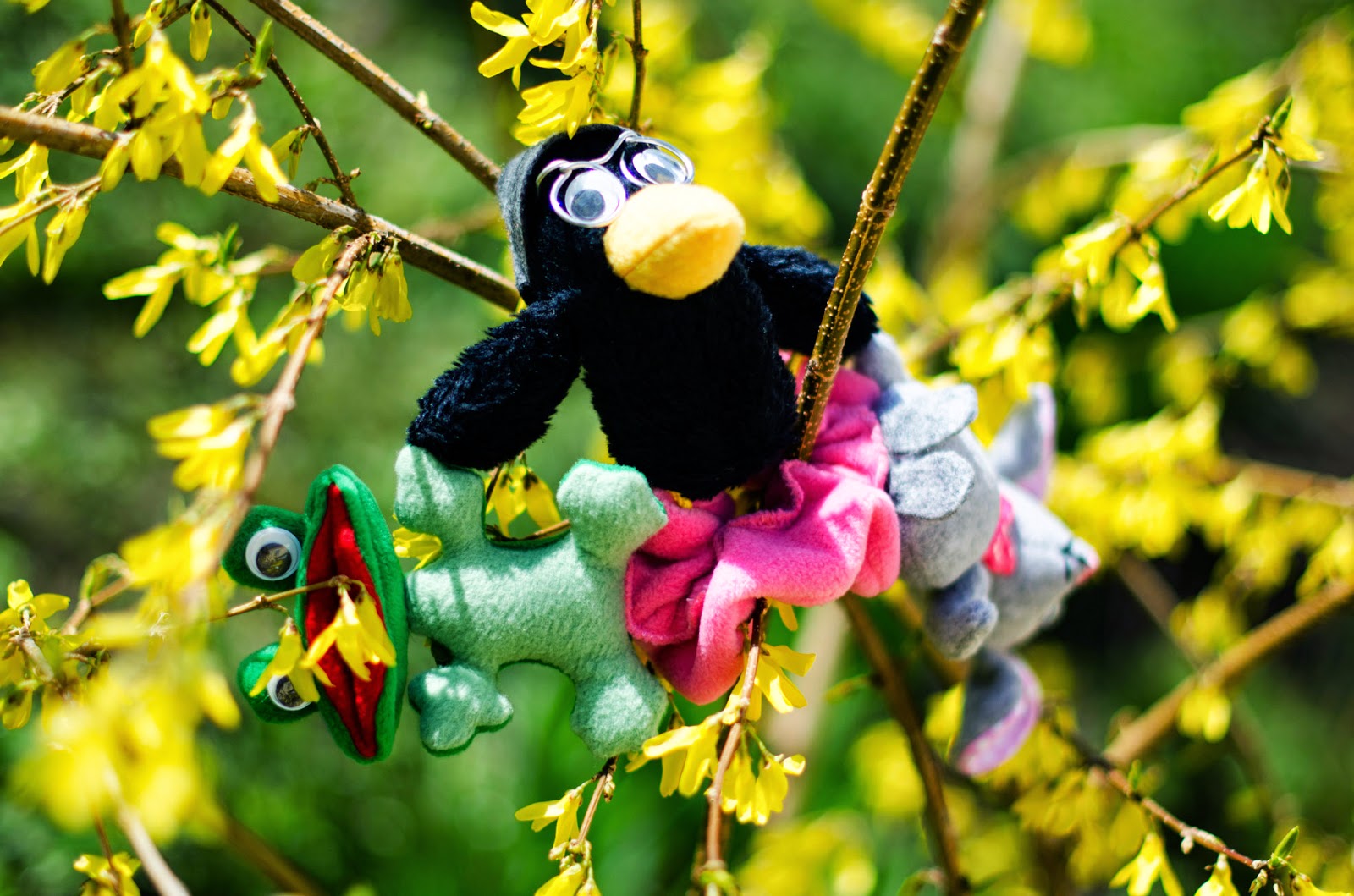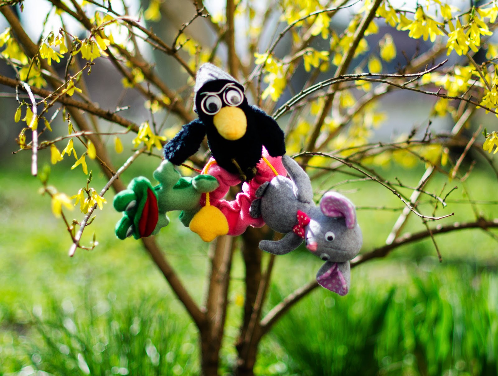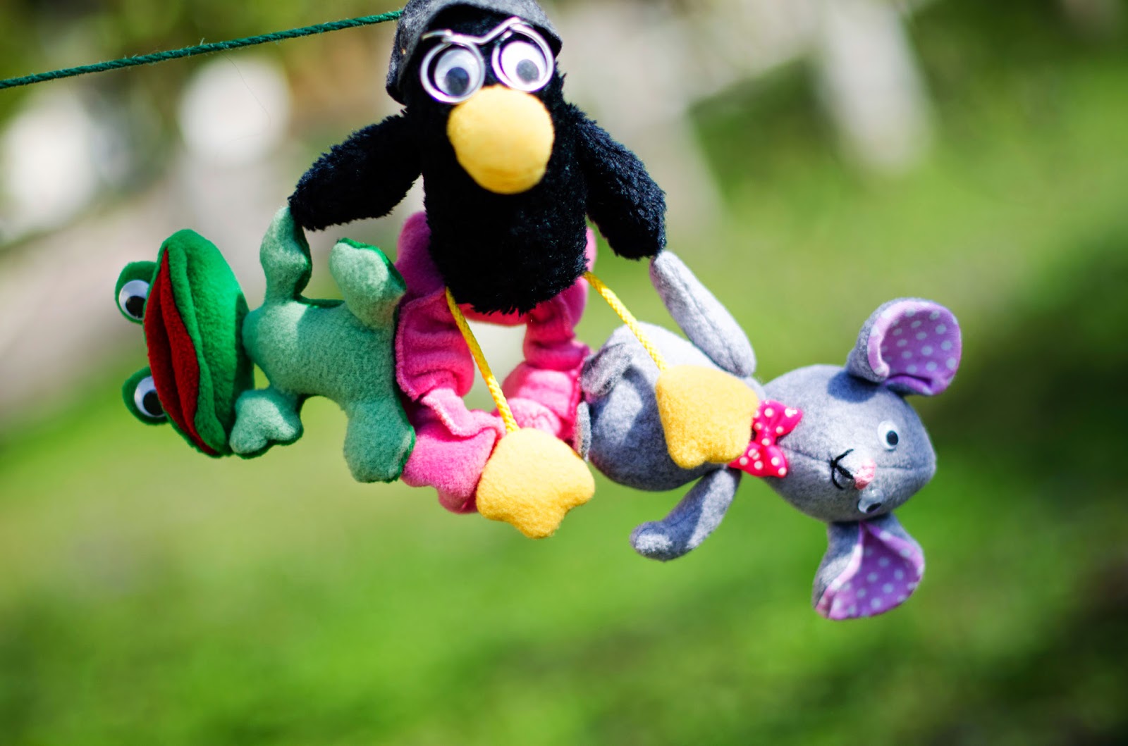 звірята пришиті до основи на резинці, та зчіплені між собою за лапи/крила