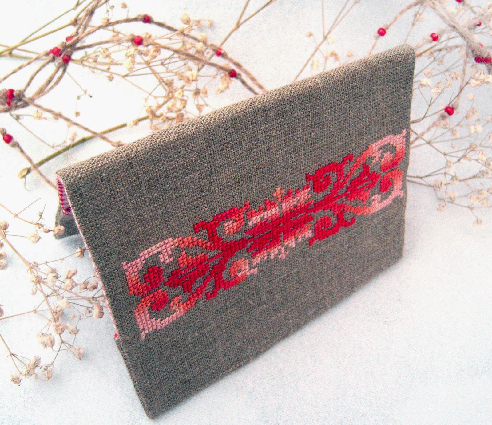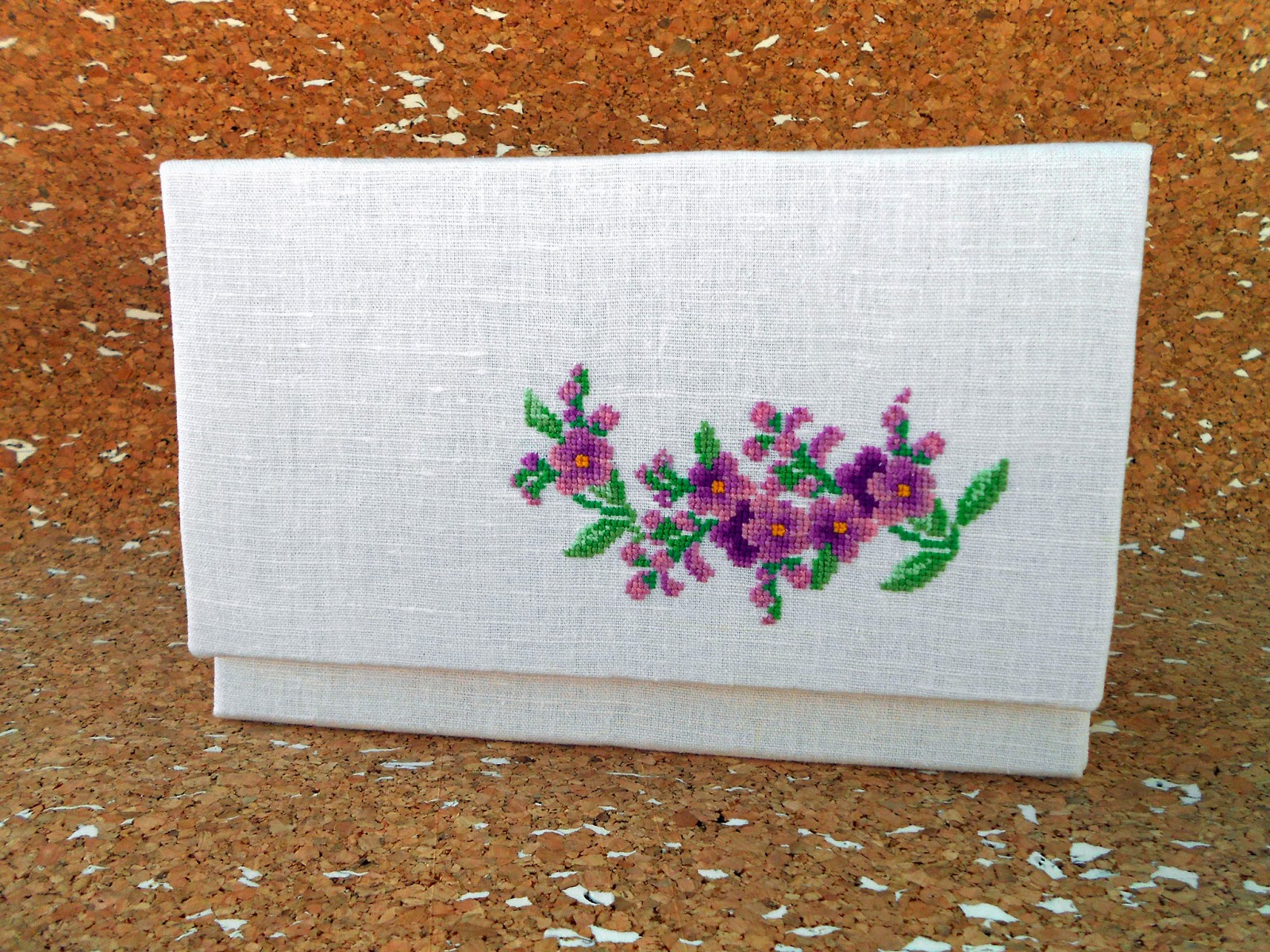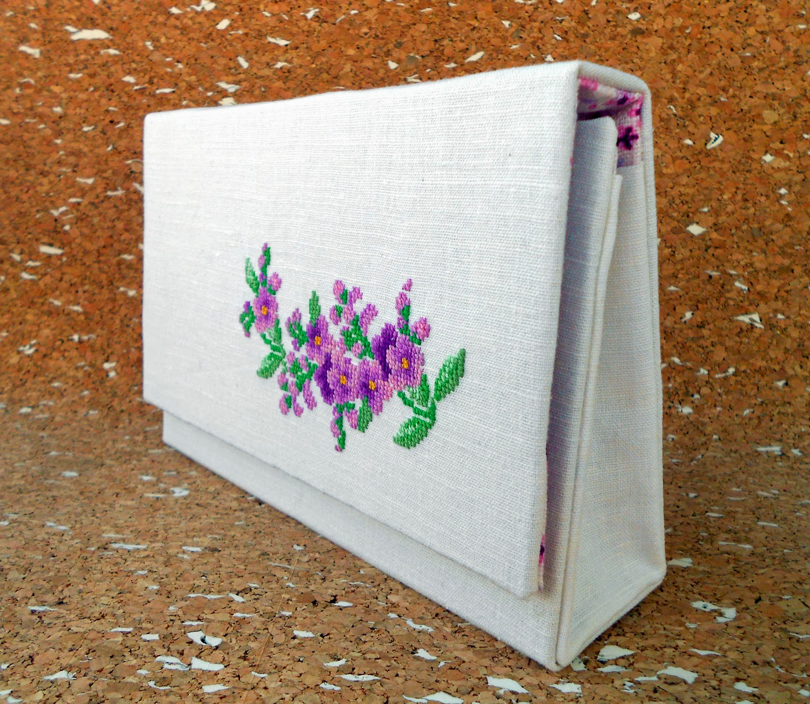 Клатч виготовлениий у техніці картонаж. Матеріали: льон, палітурний картон, картон, клей Момент Кристал, магнітна кнопка, ручна вишивка муліне