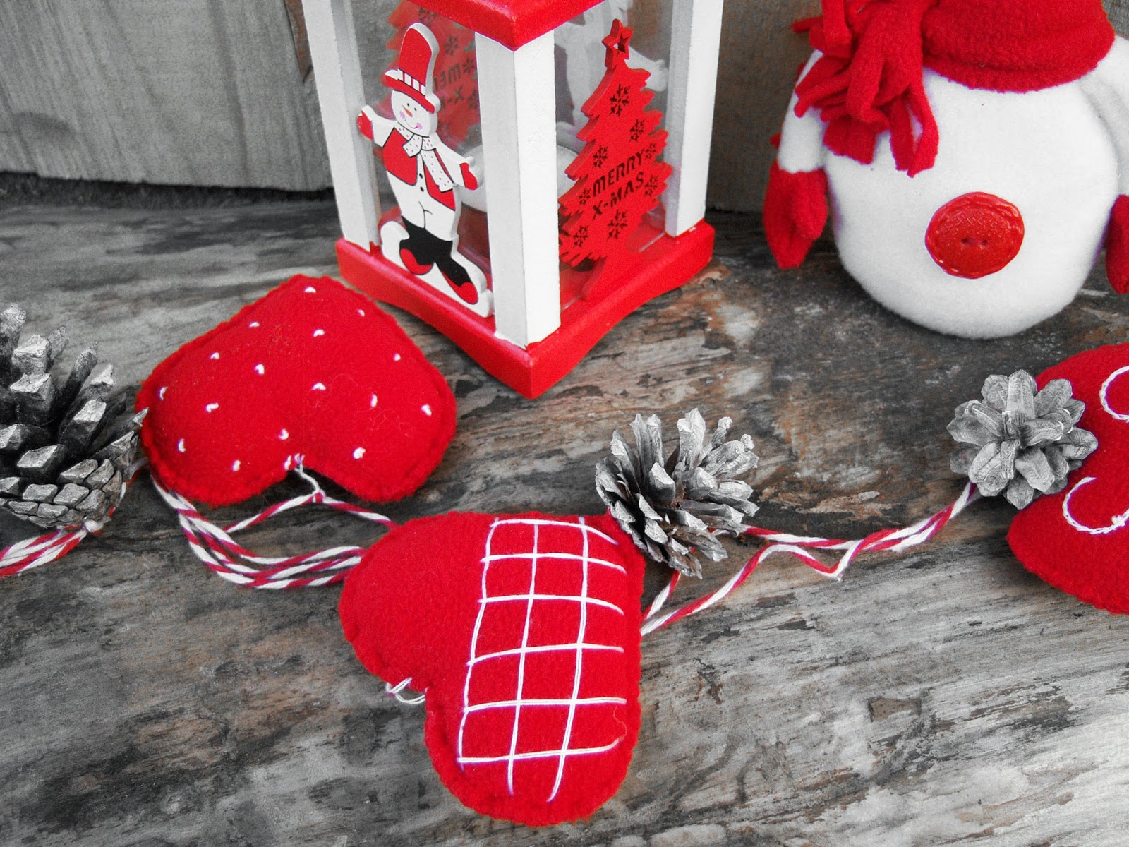 Гірлянда з флісових сердечок, трішки декорованих вишивкою, та шишок, підфарбованих білою фарбою на лляному двоколірному шнурі