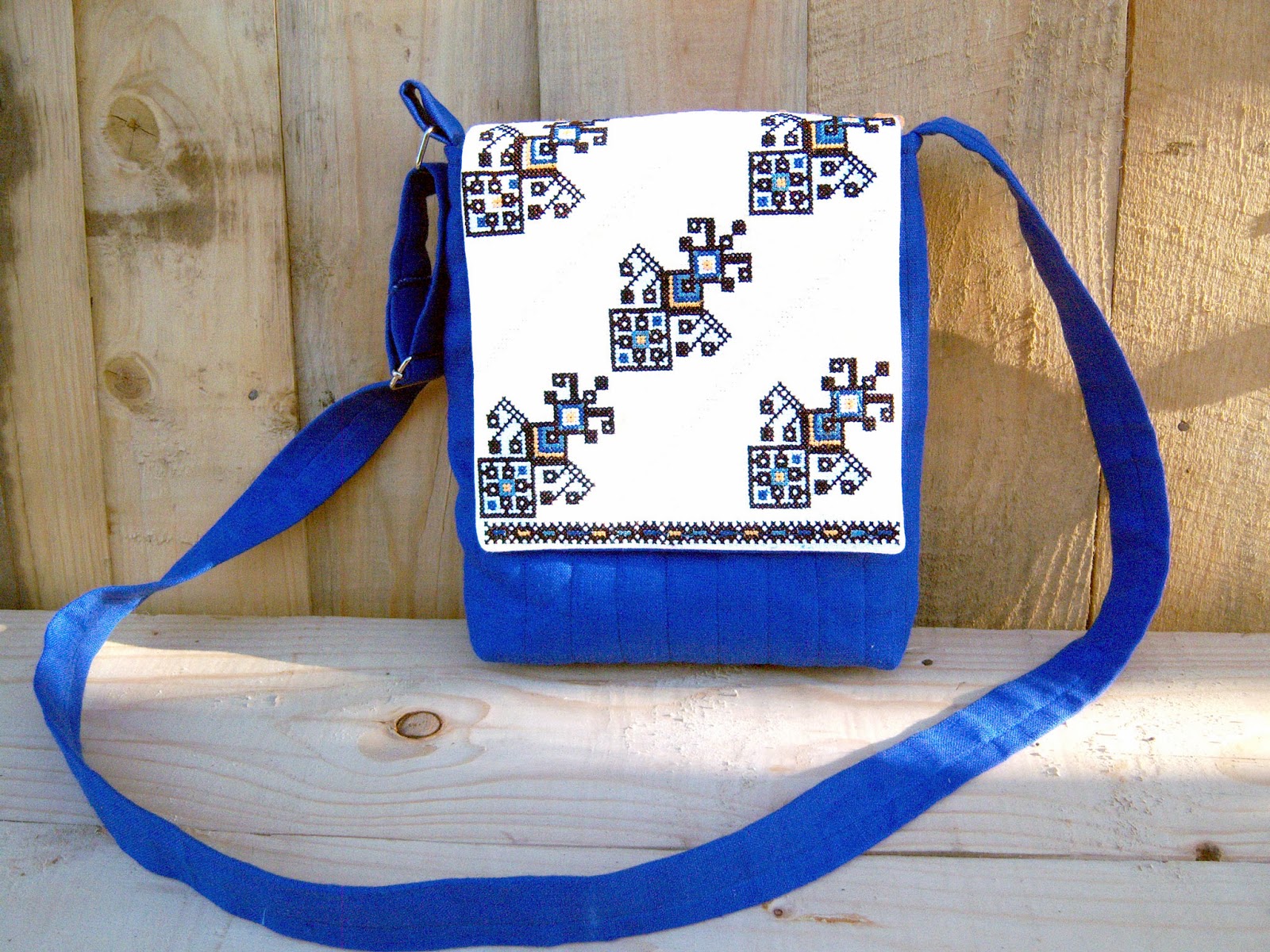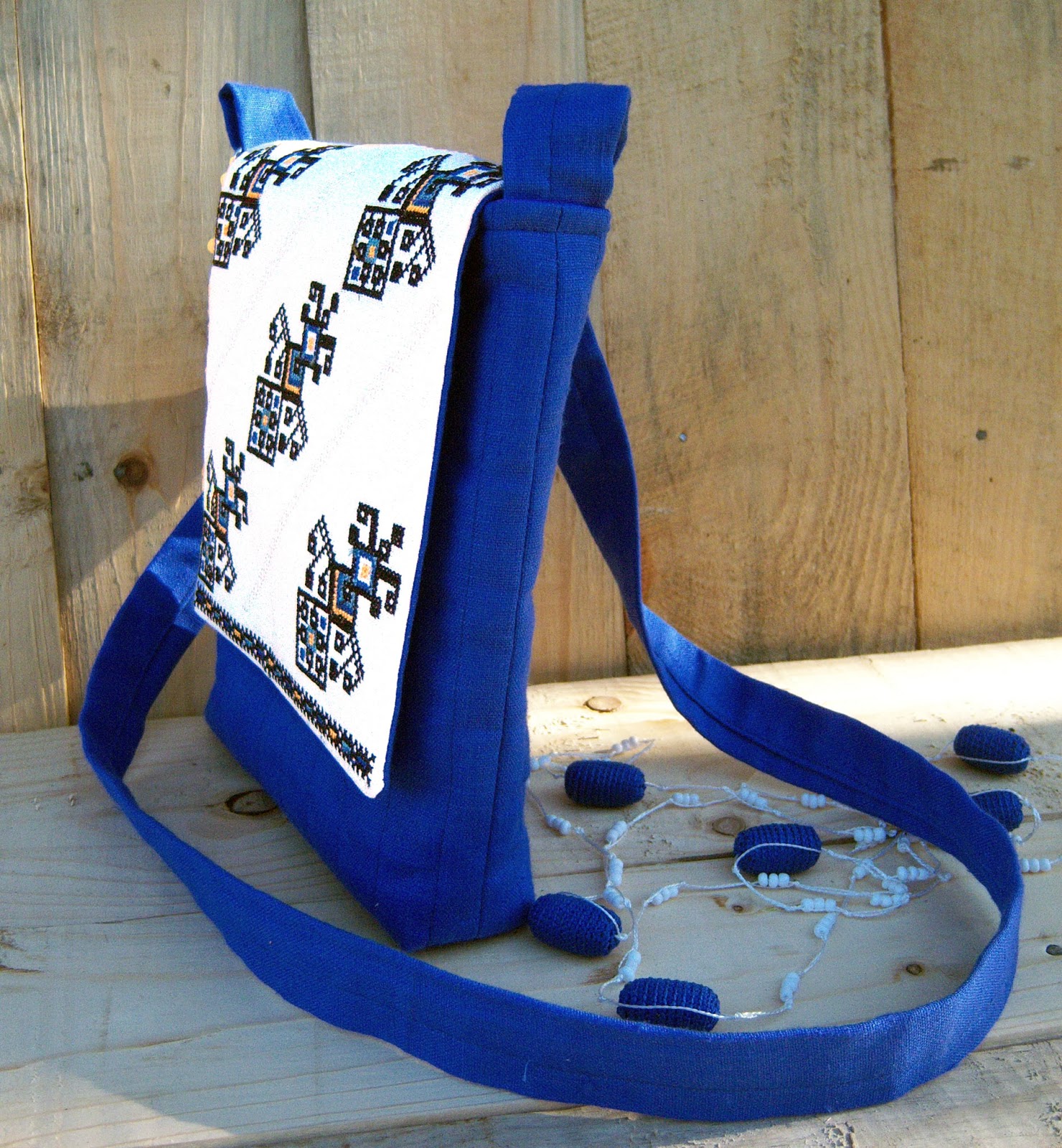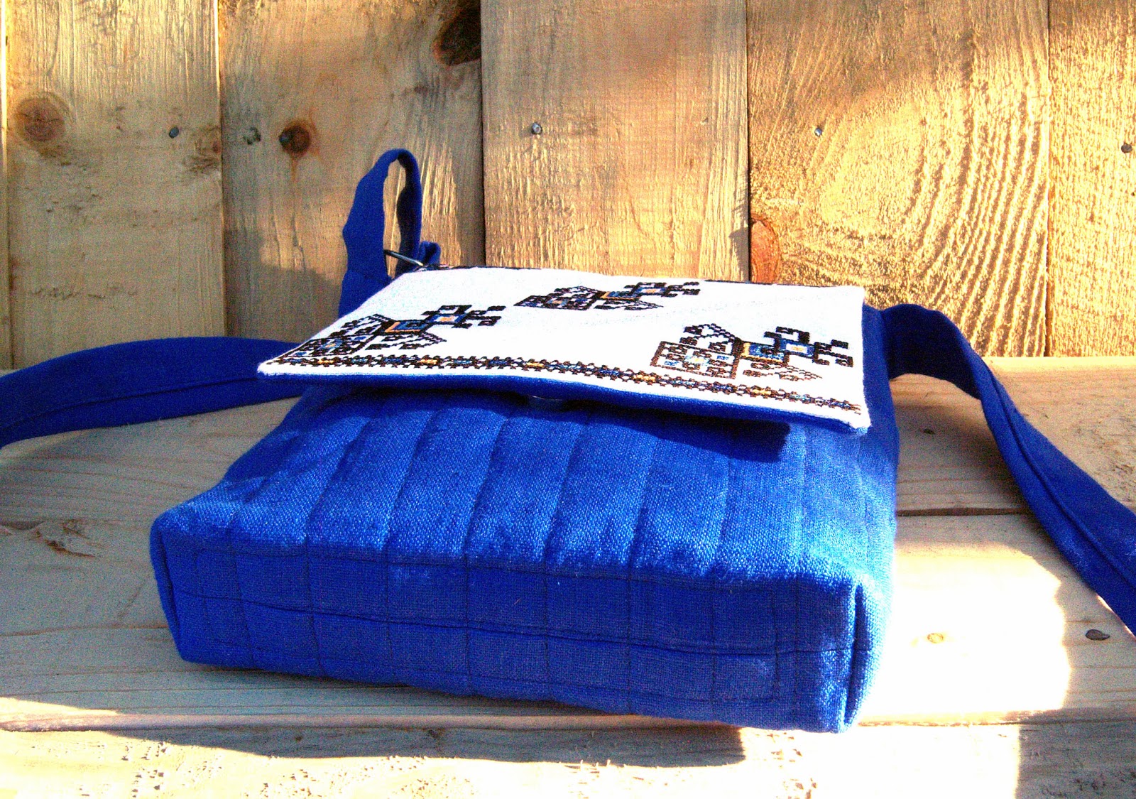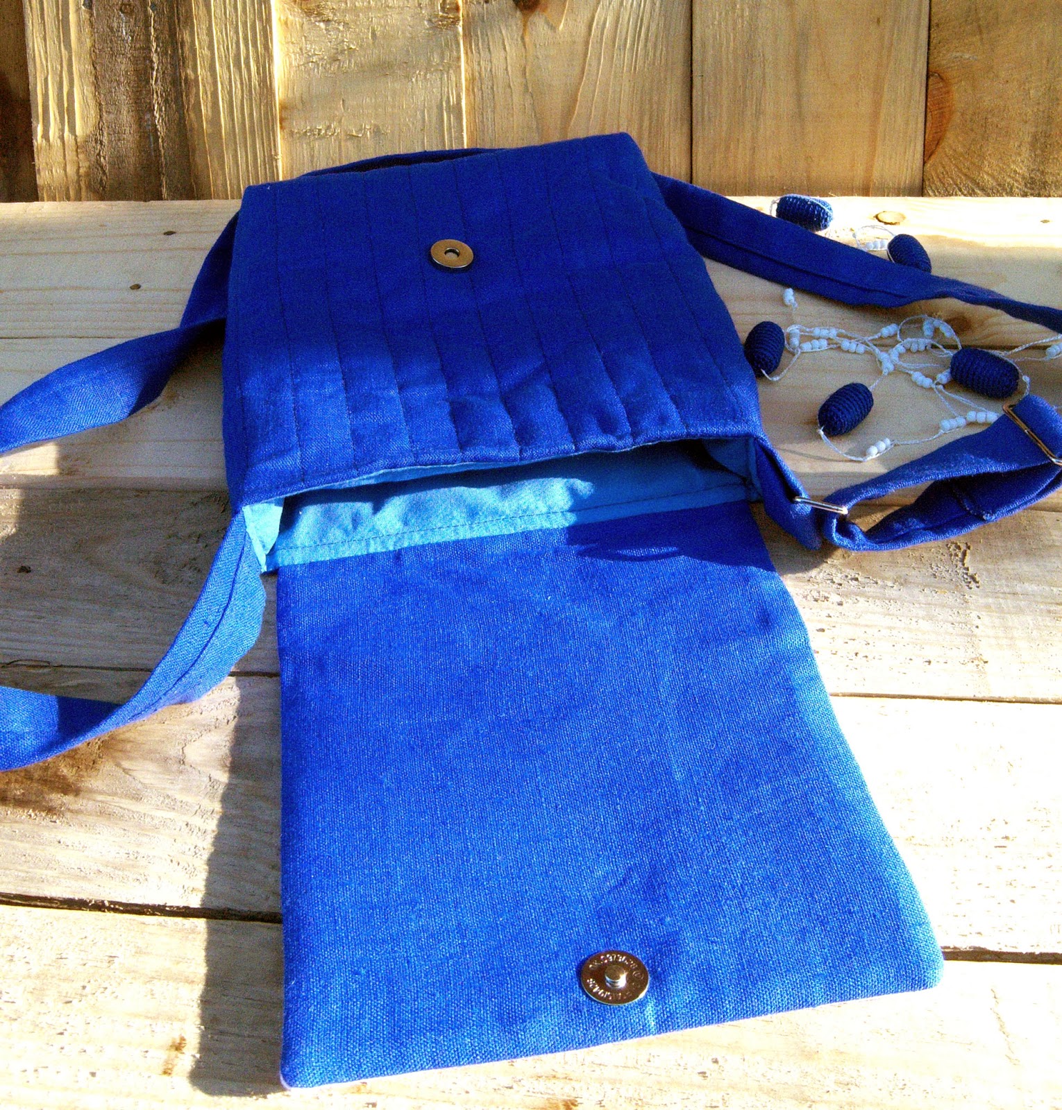 Невеличка сумочка через плече, видовженої форми. Основа - синій льон, прострочений з синтапоном, що додає рельєфності, м'якості та стійкості :-))))