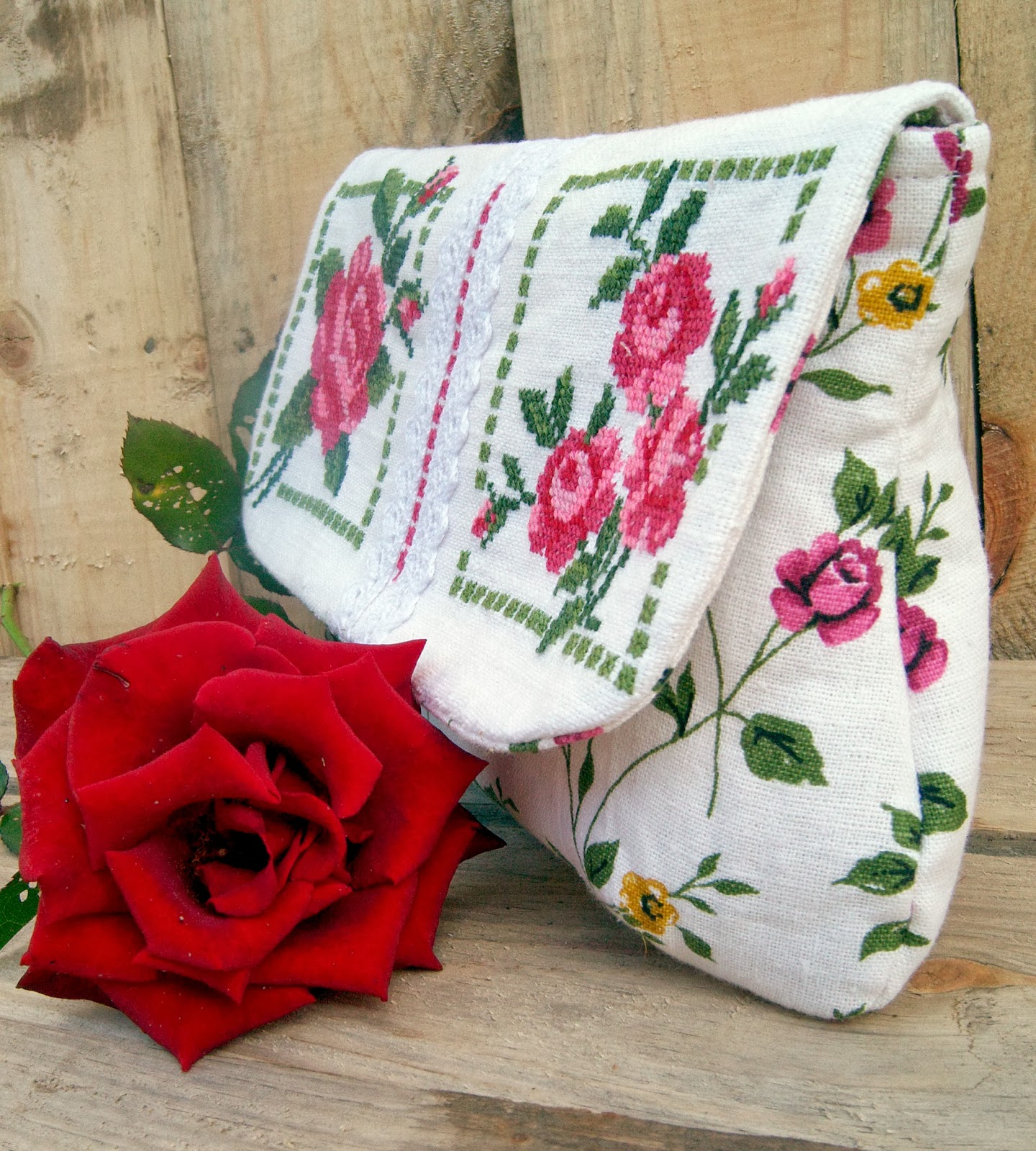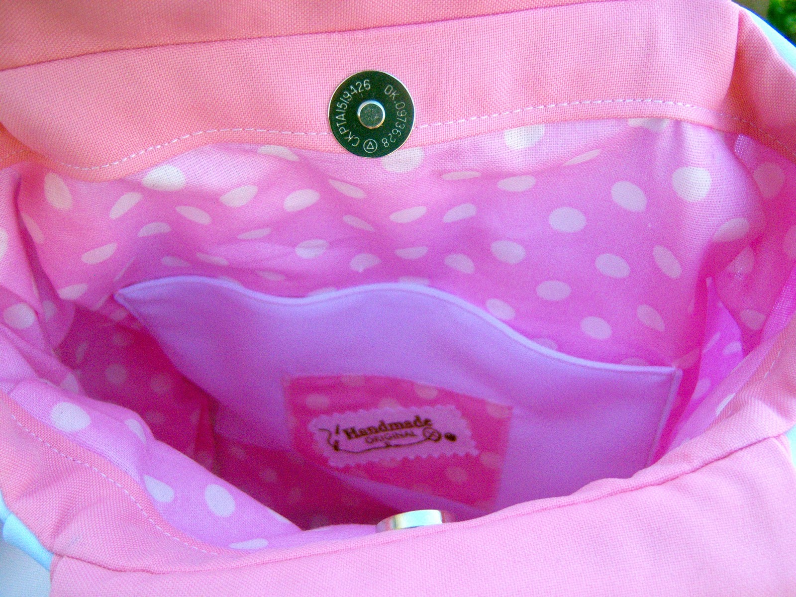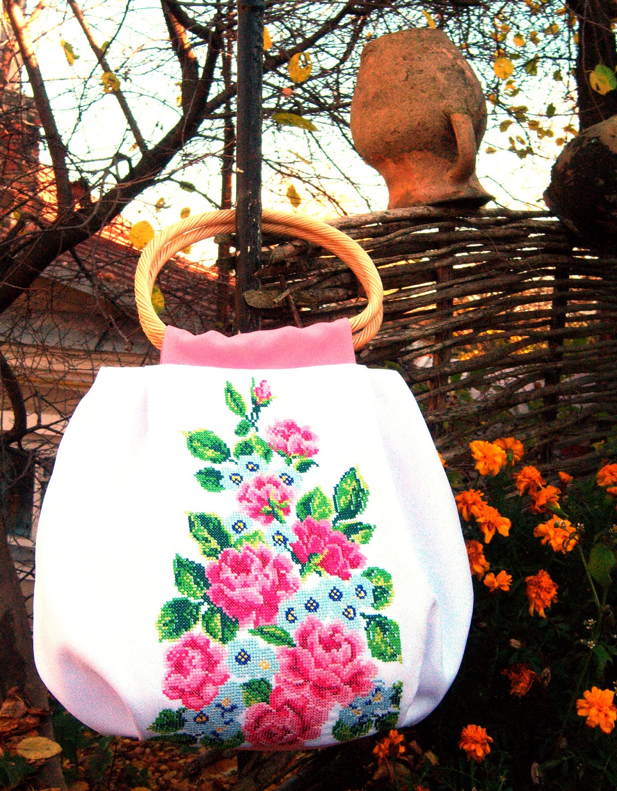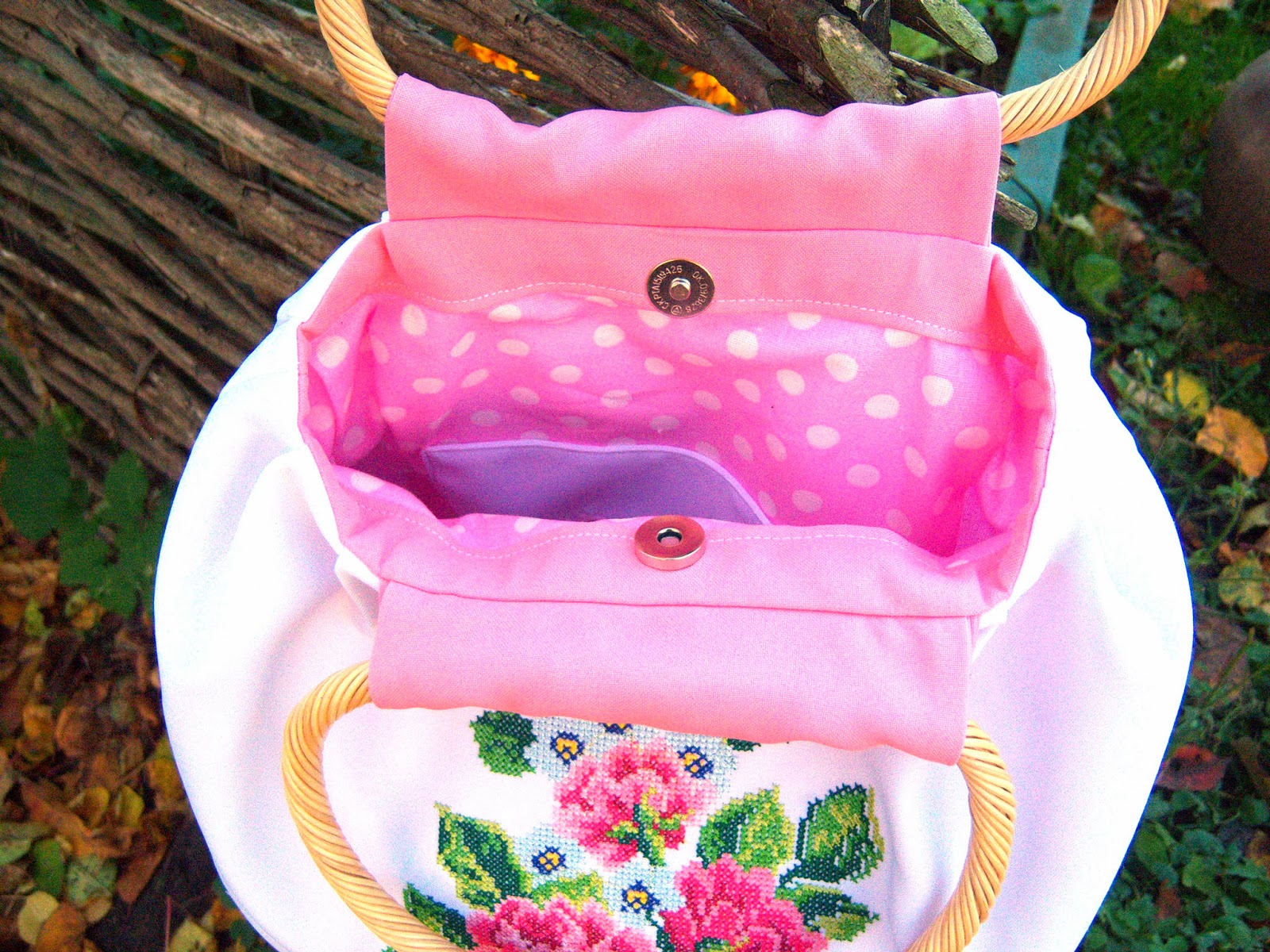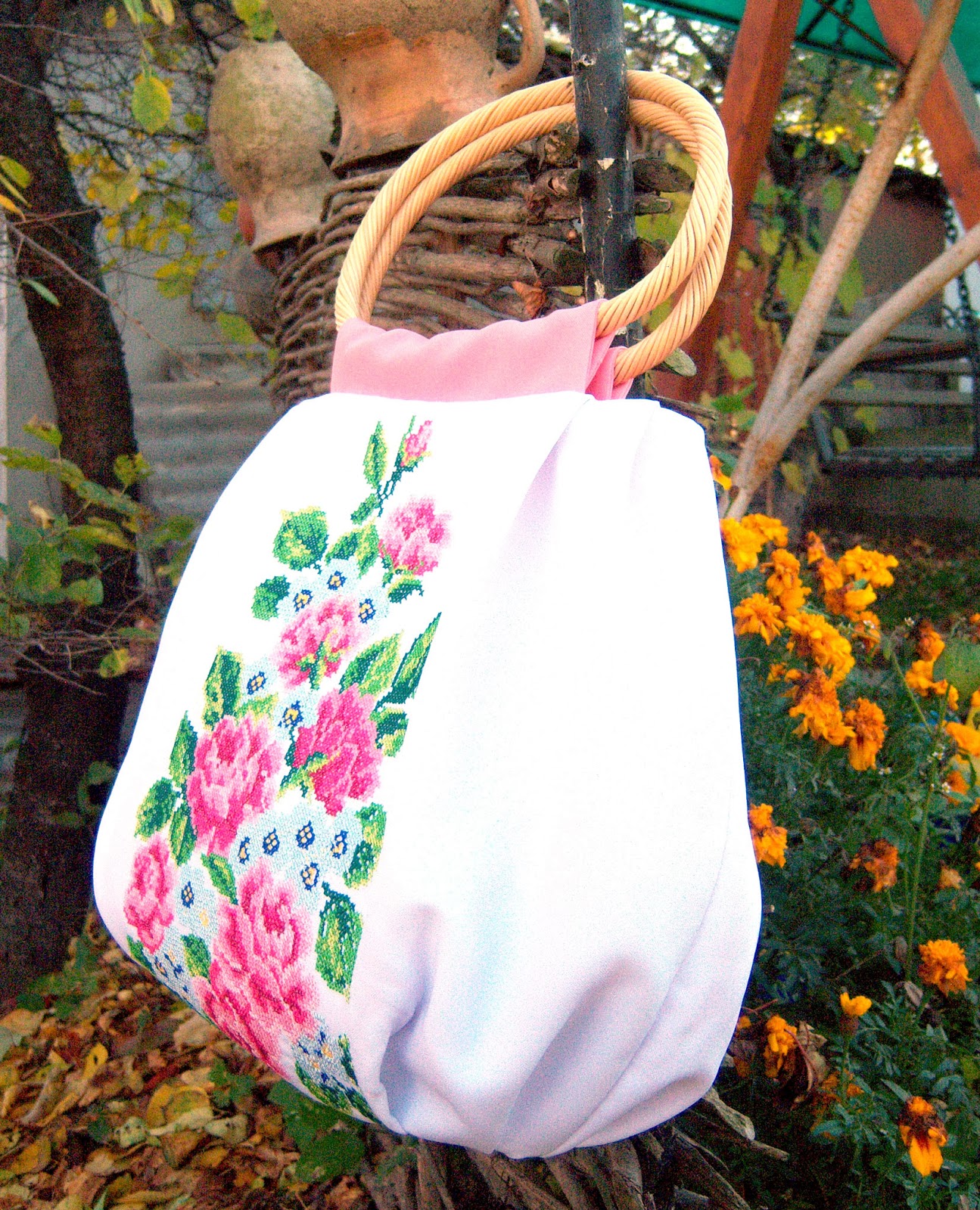 Форма сумочки якось склалася сама собою. Вишивка досить габаритна, тому хотілося чогось відповідного. Матеріал - габардин білого та рожевого кольорів. Підкладка - бавовна в горошок.