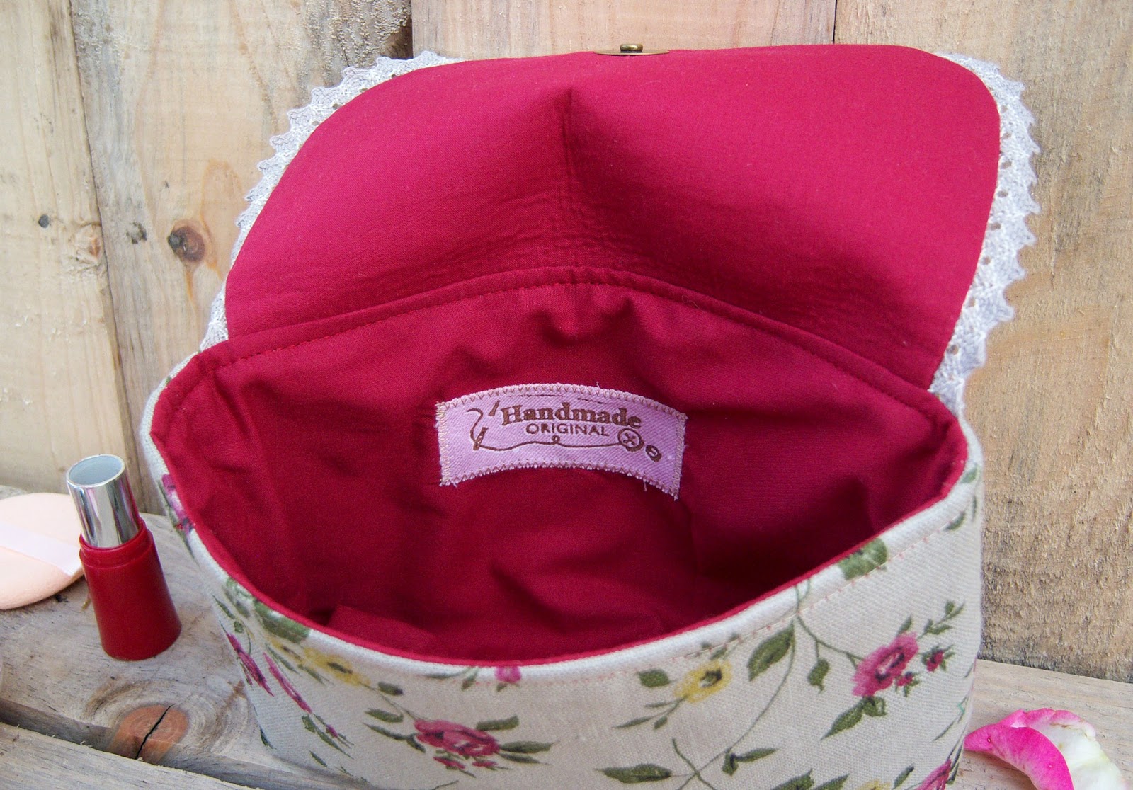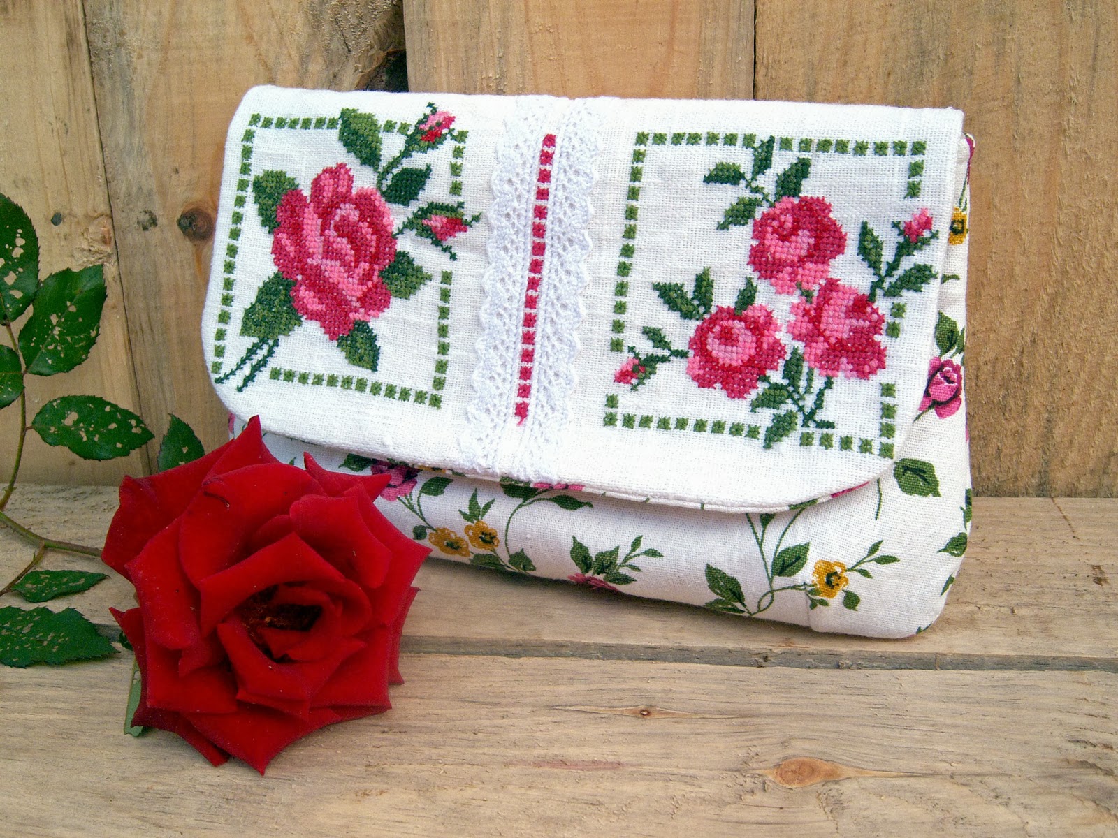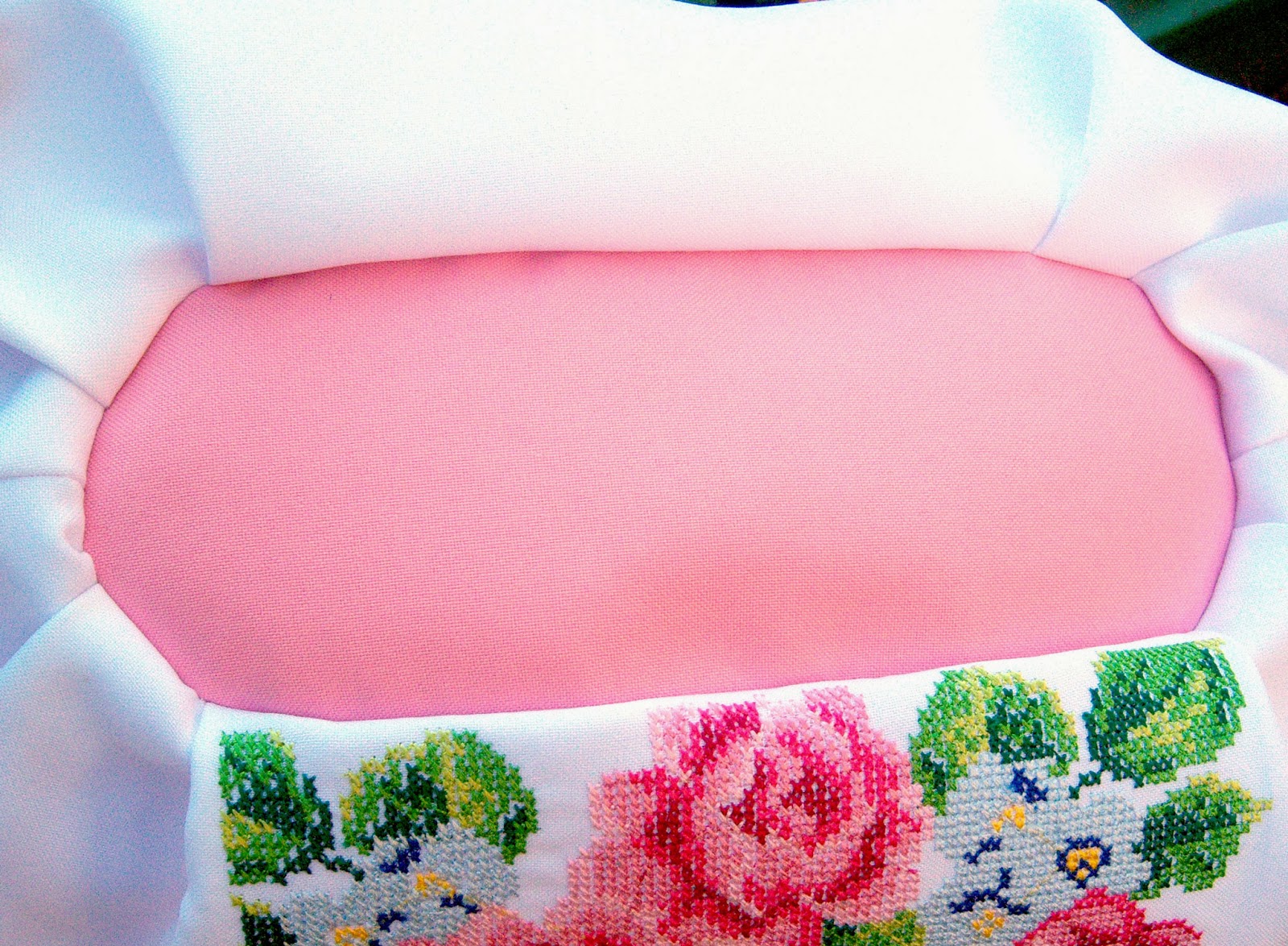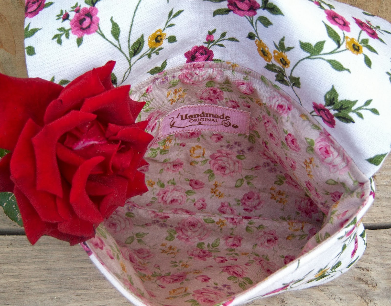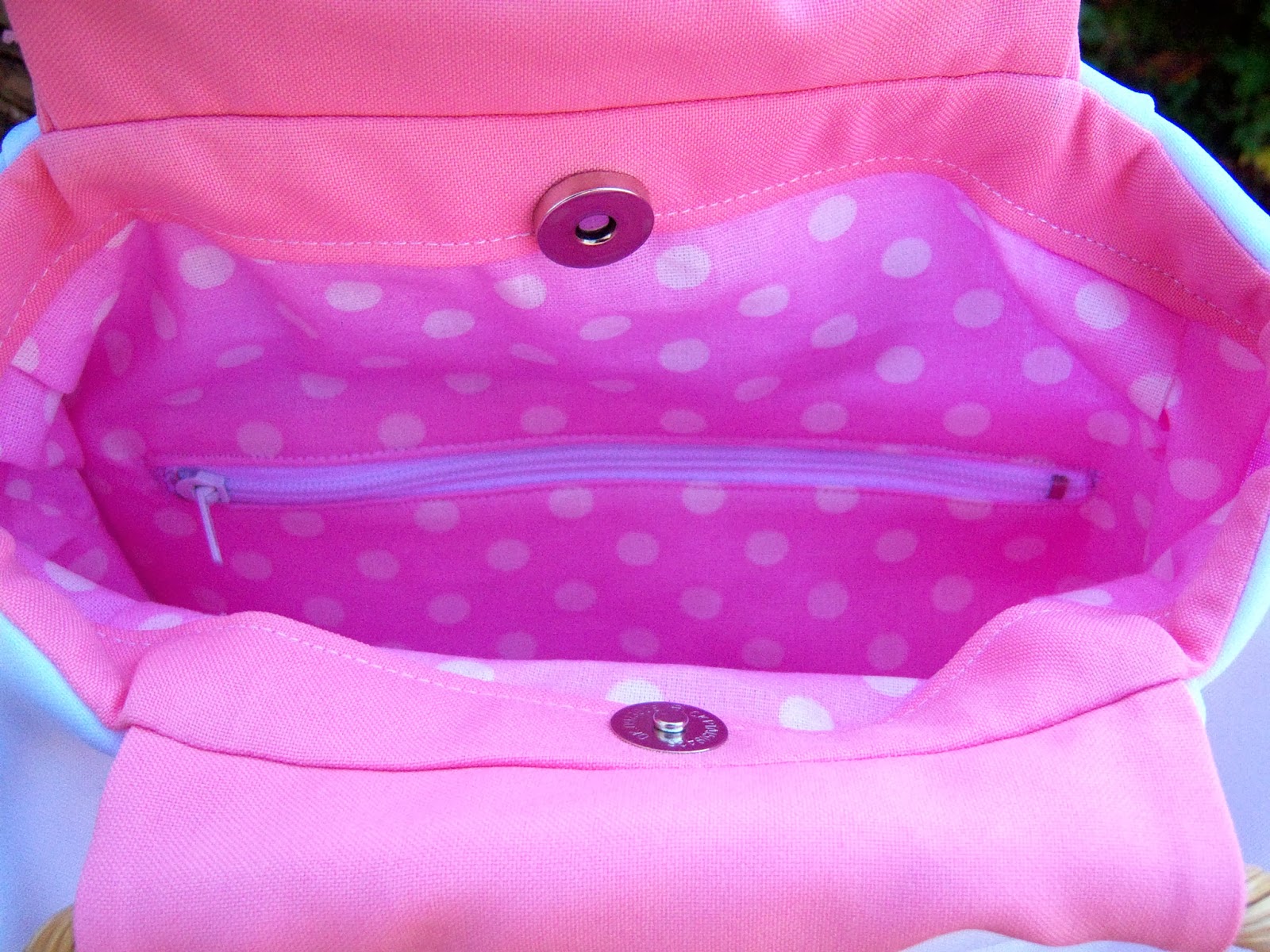 Форма сумочки якось склалася сама собою. Вишивка досить габаритна, тому хотілося чогось відповідного. Матеріал - габардин білого та рожевого кольорів. Підкладка - бавовна в горошок.