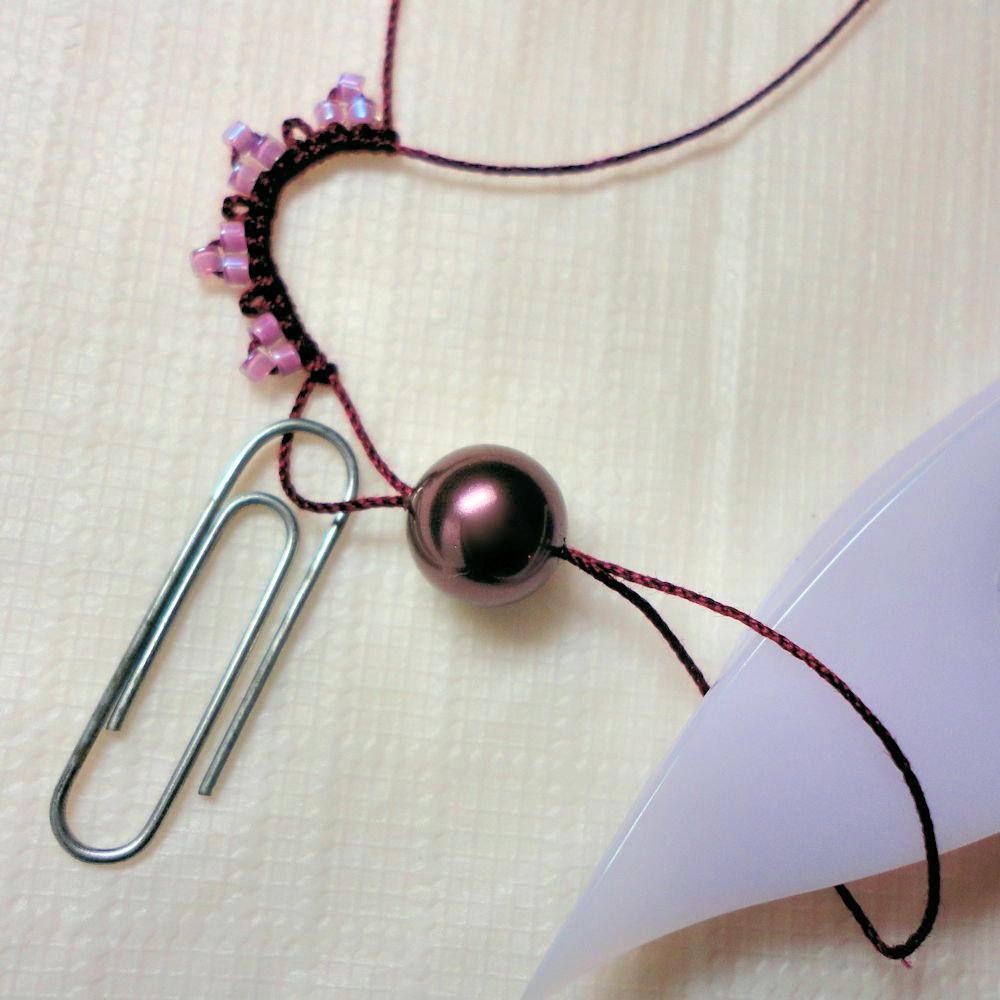 После того, как шарик помещается на петли нити, поставить трансфер хотя цикла. Уловка, которую я хотел бы использовать это, чтобы оставить скрепку в качестве заставки пространство, чтобы сделать окончательный присоединиться легче. Скрепка висит между началом и фриволите бисер, так что это вроде как проведение небольшой пико временно. |