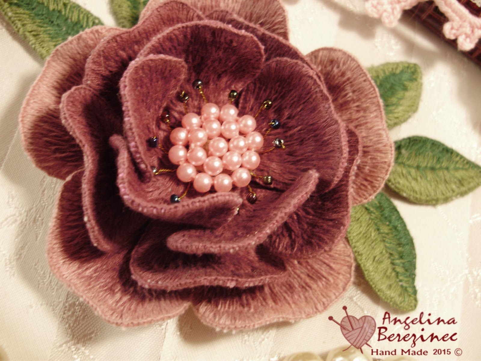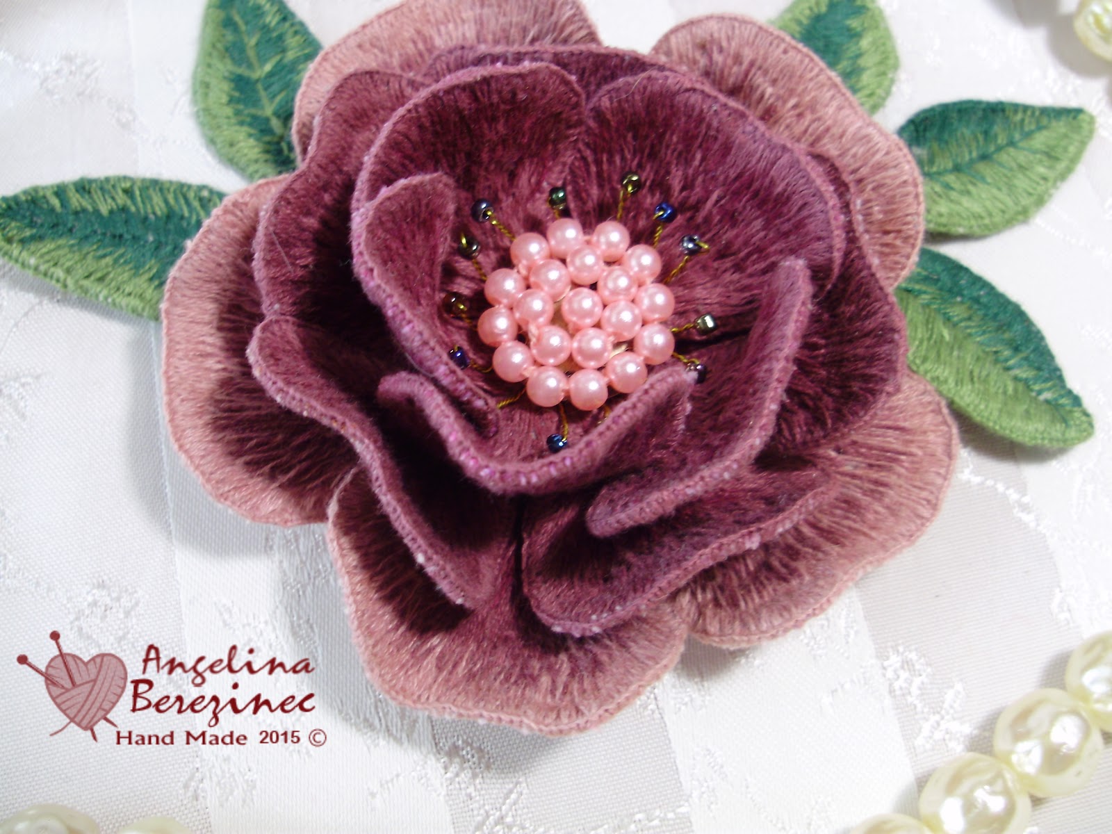 Брошь "Винная роза" выполненная в технике объемной вышивки гладью (STUMPWORK).