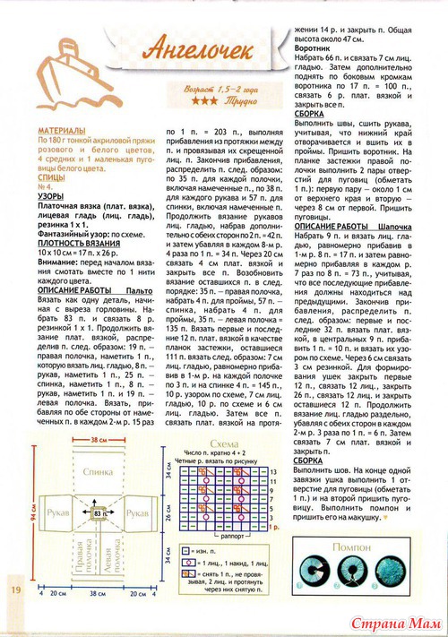 22 п. и 31 р. = 10 см, узор (в 1 нить), спицы 4 мм