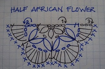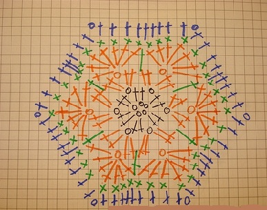1-й круговой р., белая нить: 1 возд. п. вместо 1 -го ст. б/н, * 3 возд. п., 3 ст. 2/н, 3 возд. п., выполнить 1 ст. б/н в кольцо, повторить от * 2 раза, не выполнять последний ст. б/н, а перейти