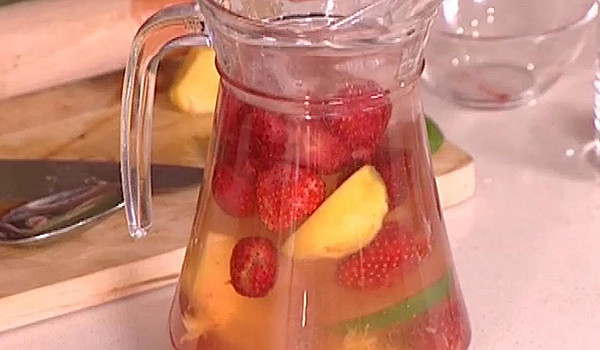 2. Залейте охлажденным белым вином, перемешайте. Охладите, перед подачей засыпать в кувшин лед.
