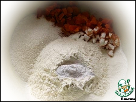 В чашке смешать муку, сахар, разрыхлитель, корицу (я не использовала) и нарезанную курагу. |