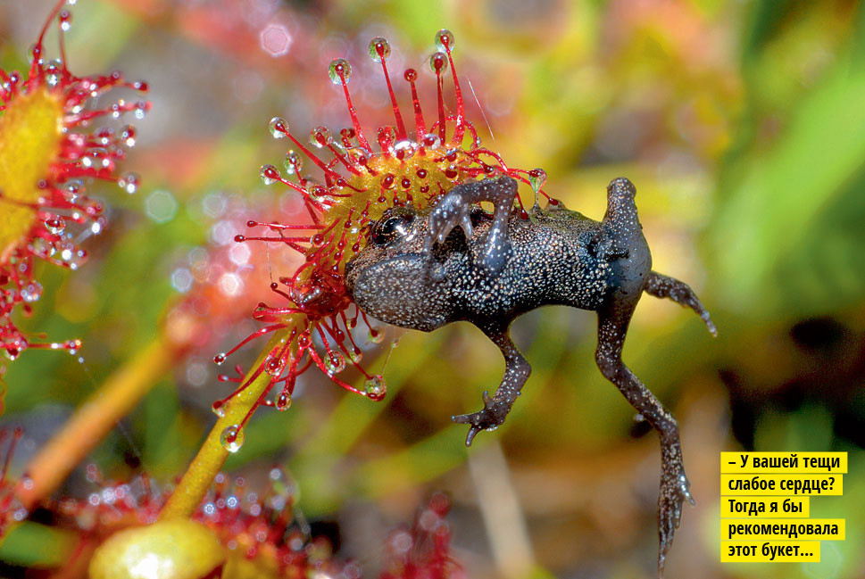 Росянка — это род плотоядных растений, встречающихся почти на любых видах почв. Обычно они питаются насекомыми, хотя однажды встретилась фотография, на которой росянка пыталась переварить мышь. На сей раз тревожный сигнал поступил из Франции: один энтомолог, фотографирующий в парке недалеко от Страсбурга, заметил, как это самое растение пыталось сожрать лягушку. Лягушка, правда, сумела отбиться, но тенденция настораживает.