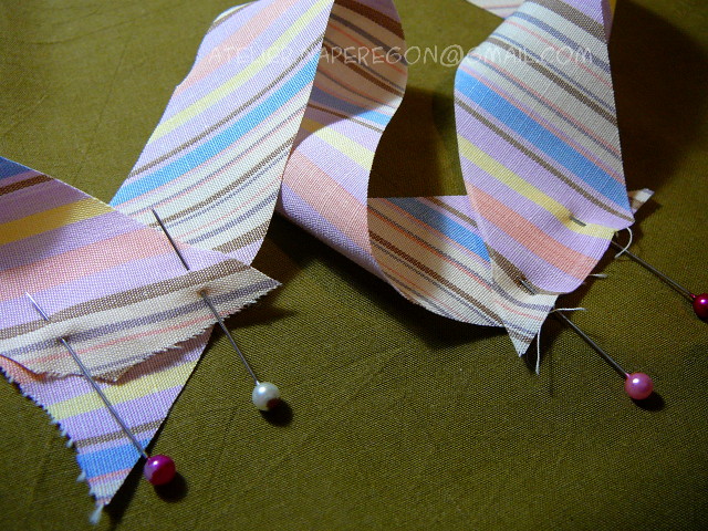 разрезаем косую ленточку пополам, разрезанный край будет обращён к внешней стороне плечевого шва