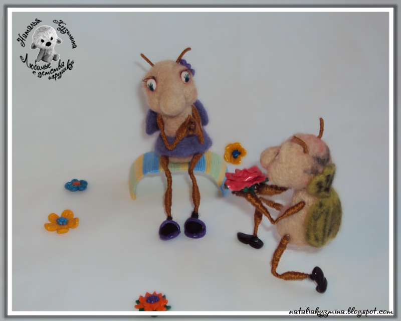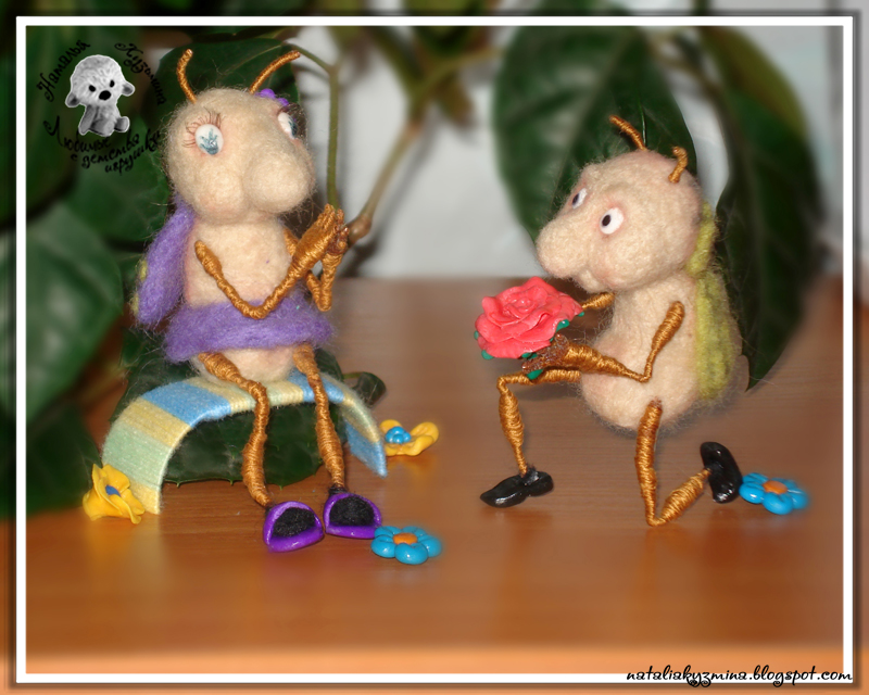 PS:Жучки - это мой первый опыт валяния игрушек из шерсти, до этого только приваливала мордочки. Результатом в общем довольно, хотя конечно не идеально (мне до этого еще "как до Китая пешком" ).