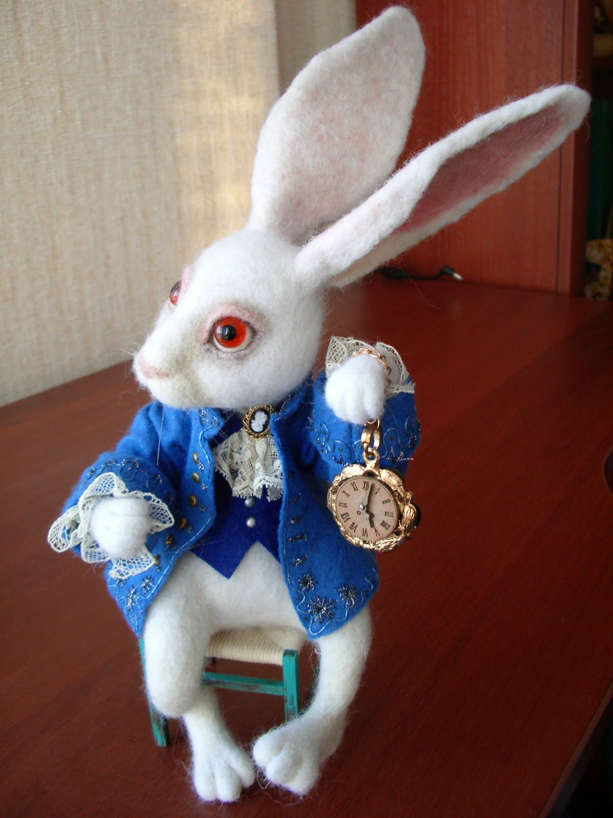 На сегодняшний день одно из главных увлечений - валяние из шерсти. Мне больше нравится сухое валяние. Вообще, люблю шерсть за её замечательные свойства - с лёгкостью принимать любую задуманную форму и воплощать фантазии автора. Когда я посмотрела фильм Тима Бёртона "Алиса в Стране чудес", то сразу же решила, что обязательно сделаю чудесных персонажей из этого фильма! Техника сухого валяния из шерсти идеально подошла для этого. Так появилась композиция "Безумное чаепитие". В данном МК хочу показать этапы изготовления одного из главных персонажей "Алисы в Стране чудес" - белого кролика.