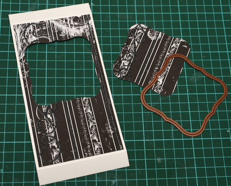 Дальше для оформления основной части открытки, т. е. того самого окошка за «ставнями», делаем две заготовки: одна - чуть меньше самой открытки, размером 11,5х16,5 см, другая будет как бы одеваться на первую, размером 9х19,5 см. Тут вторую деталь делаем больше по длине на 1,5 см с каждой стороны, чтобы эти «хвостики» затем одеть на первую заготовку. Бигуем «хвостики», украшаем обе заготовки скрап-бумагой. Для открытки я выбрала листы коллекции ENCHANTED от Bo Bonny, одной из любимейших мною, которая своими узорами мне напоминает новогодние.